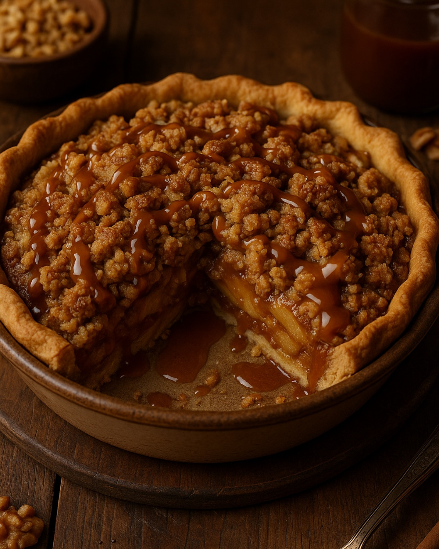 Instructions: 1. Make the caramel: Heat sugar and water in a saucepan over medium heat. Once amber, add cream (carefully), butter, and salt. Stir until smooth. Cool. 2. Make the filling: Toss apple slices with sugar, cinnamon, nutmeg, flour, lemon juice, and salt. 3. Assemble the pie: Place crust in a greased pie dish. Fill with apple mixture. Drizzle with half the caramel sauce. 4. Add crumble topping: Mix flour, oats, brown sugar, and cinnamon. Cut in cold butter until crumbly. Sprinkle over the apples. 5. Bake: Bake at 375°F (190°C) for 45–55 minutes until golden and bubbling. Cool 1 hour before serving. 6. Serve: Drizzle with remaining caramel and top with ice cream if desired.