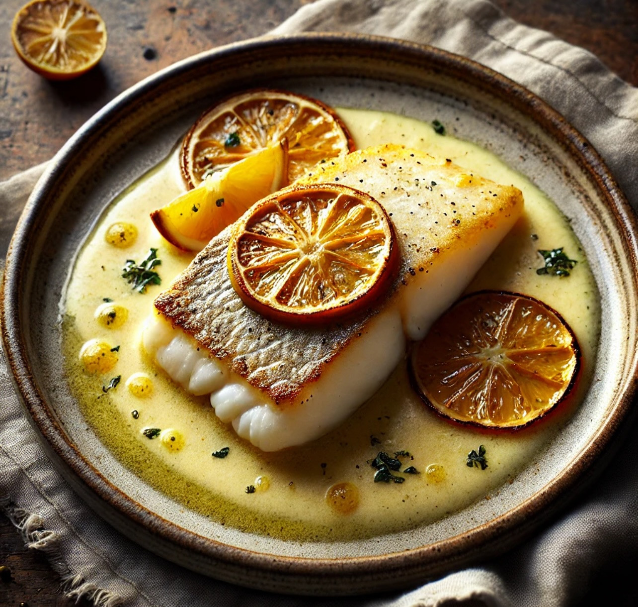 This dish is all about quiet sophistication. A golden fillet of white fish, gently seared until flaky, served over a pool of citrus beurre blanc — creamy, tangy, and deeply buttery. It’s the kind of plate that speaks softly, but impresses fully.