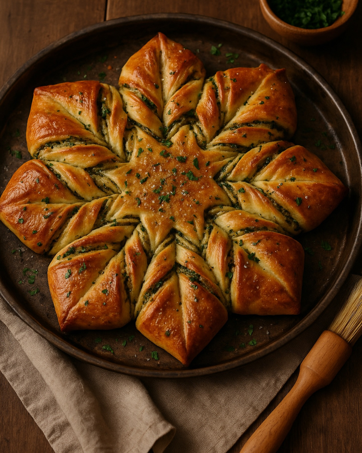 A soft, pull-apart star-shaped bread swirled with garlic, fresh herbs, and parmesan cheese, brushed with golden melted butter and baked to perfection. It’s the ultimate savory centerpiece — perfect for gatherings or cozy weekends.