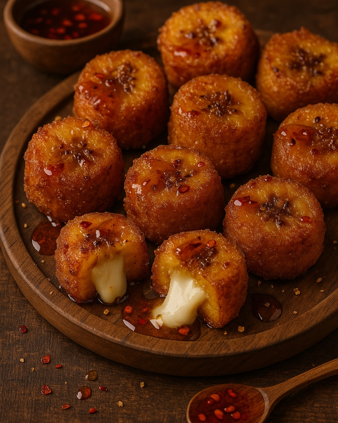Crispy Fried Mozzarella-Stuffed Plantain Bites with Hot Honey