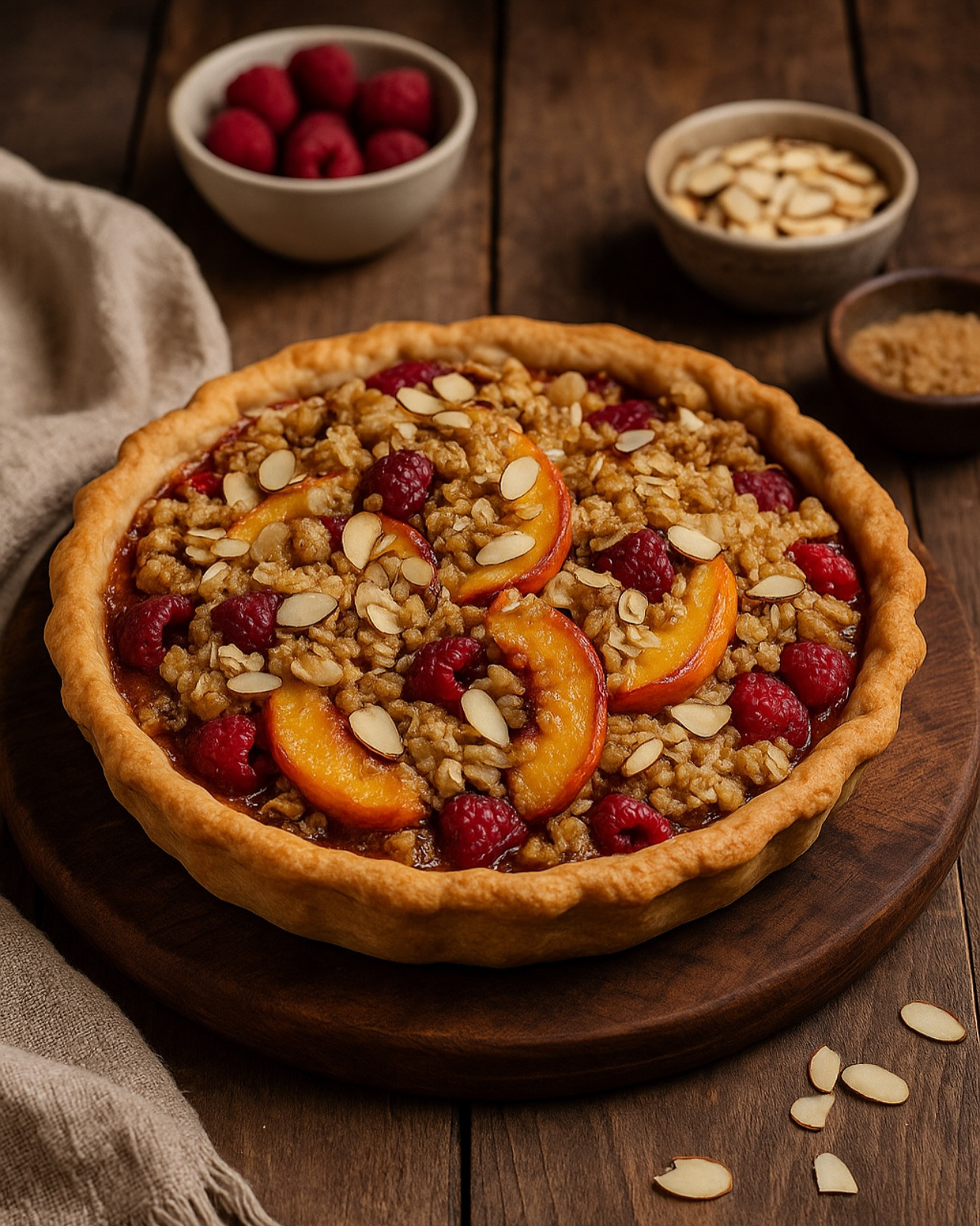 Peach & Raspberry Almond Crumble Pie Buttery pie crust filled with juicy peaches and raspberries, topped with a golden almond crumble — fruity, crunchy, and full of flavor in every bite.