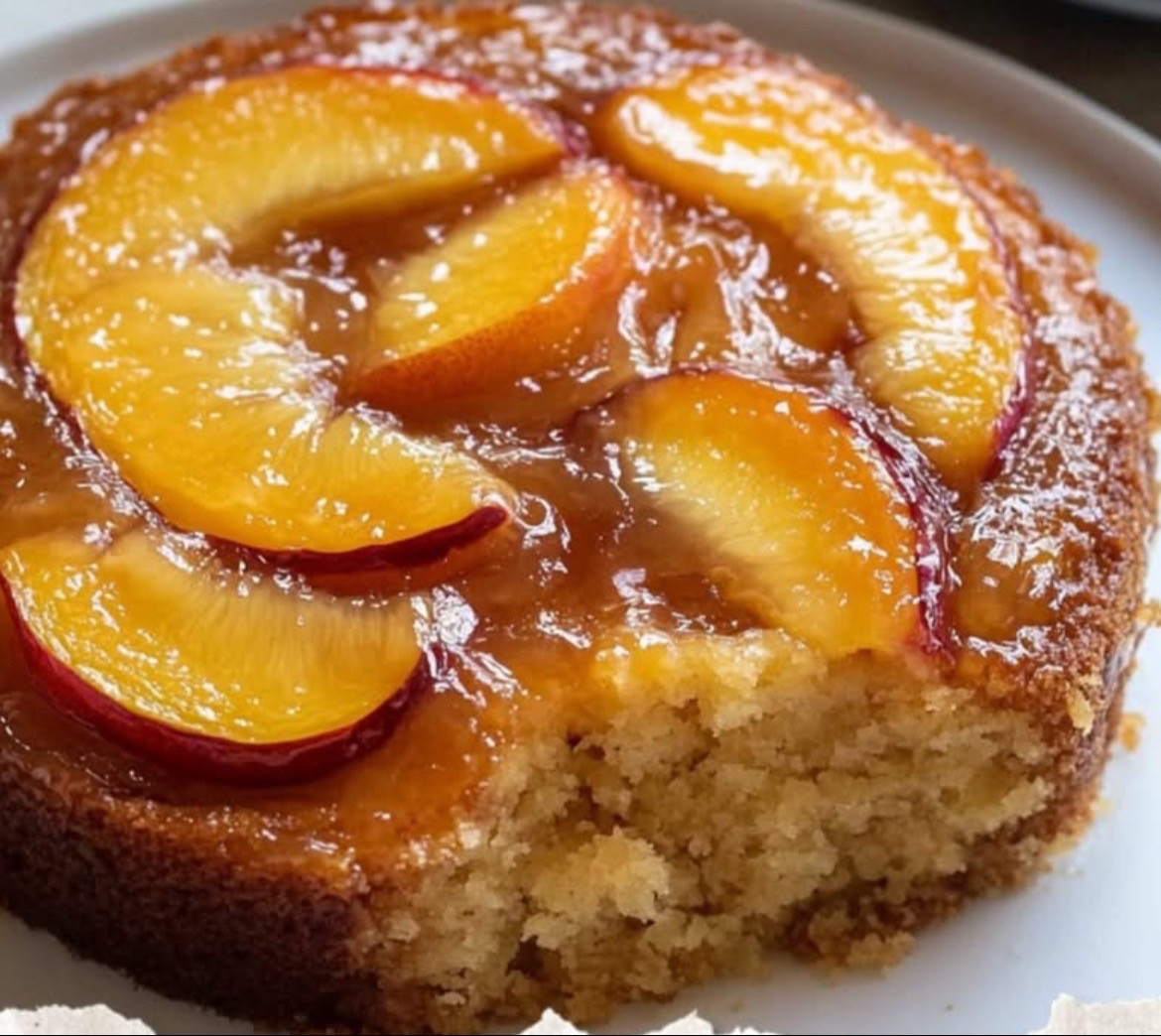 Directions: Preheat oven to 350°F (175°C). Grease a 9-inch cake pan. Melt butter in the pan and sprinkle with brown sugar. Arrange peach slices over it. In a bowl, mix flour, baking powder, baking soda, and salt. In another bowl, beat butter and sugar until fluffy. Add eggs and vanilla. Alternate adding dry ingredients and buttermilk to the wet ingredients. Pour batter over peaches and bake for 35–40 minutes. Let cool for 10 minutes before flipping onto a plate. #cake #cakerecipe #peaches #peachcake #upsidedowncake #southerndessert