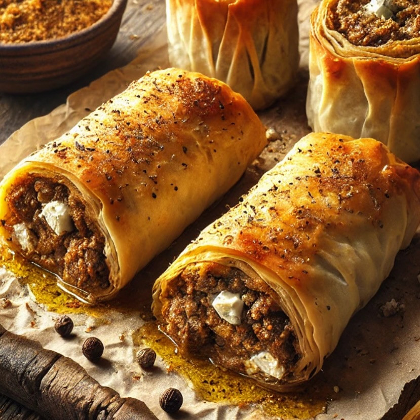 Ingredients (Makes 10–12 rolls): • 1 tbsp olive oil • 1 small onion, finely chopped • 2 cloves garlic, minced • ½ lb (225g) ground lamb • 1 tsp ground cumin • 1 tsp smoked paprika • ½ tsp cinnamon • Salt & black pepper to taste • ½ cup crumbled feta cheese • 2 tbsp fresh parsley, chopped • 6 sheets phyllo pastry • 3 tbsp melted butter or olive oil (for brushing)