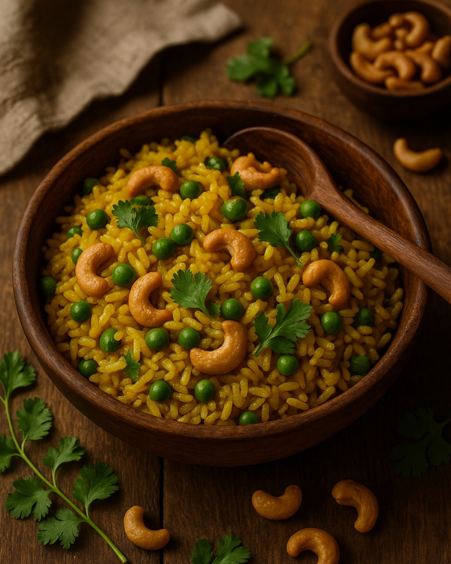 Fragrant basmati simmered in coconut milk, laced with earthy turmeric, dotted with sweet peas, and finished with buttery toasted cashews — an eye-catching side that steals the spotlight.