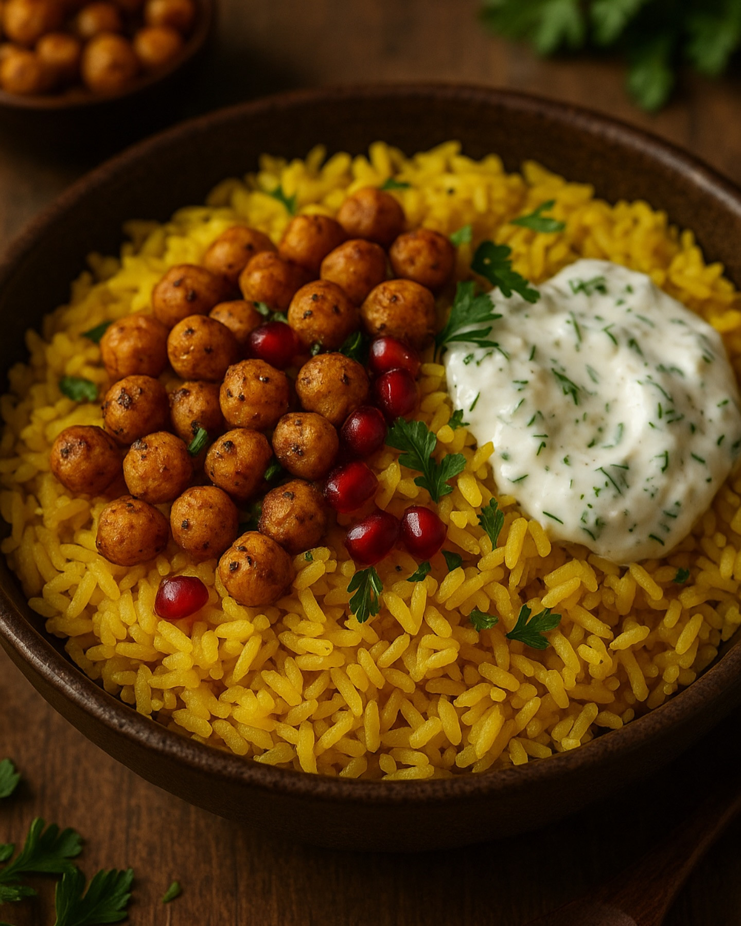 Fluffy yellow basmati rice spiced with turmeric and garlic, topped with crispy roasted chickpeas and a swirl of cooling herbed yogurt. It’s warm, crunchy, creamy, and packed with bold Middle Eastern-inspired flavor.
