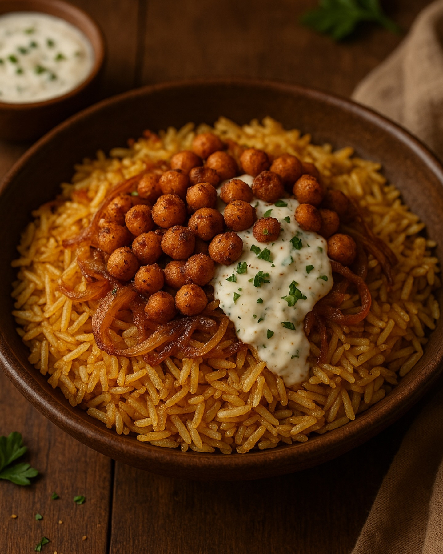 Instructions: 1. Caramelize onions: In a large pan, heat olive oil and cook onions over medium-low for 25–30 minutes until golden and sweet. Add cumin, turmeric, and salt. Stir in rice to coat. 2. Cook rice: Add water or broth, bring to a boil, cover, and simmer for 15 minutes. Let rest, then fluff. 3. Make crispy chickpeas: Toss chickpeas with oil, spices, salt, and pepper. Roast at 425°F (220°C) for 20–25 minutes until golden and crunchy. 4. Mix yogurt: Stir together yogurt, lemon juice, garlic, herbs, and salt. Chill until serving. 5. Assemble: Serve rice topped with chickpeas and drizzled yogurt. Garnish with extra herbs or lemon zest.
