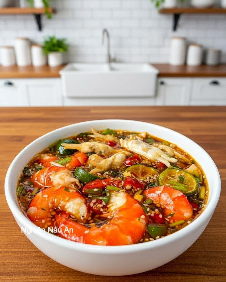 HẢI SẢN NGÂM TẮC CHUA CAY MẶN NGỌT, NGON KHÓ CƯỠNG! Tôm và ốc móng tay giòn ngọt, ngâm cùng nước mắm tắc cay thơm, điểm chút rau thơm và vừng rang món này ăn chơi, nhâm nhi hay làm món khai vị đều “hết sẩy”! Nguyên liệu cần chuẩn bị: - Tôm sú hoặc tôm thẻ: bóc vỏ - Ốc móng tay: luộc chín, tách vỏ - Tắc (quất): thái lát mỏng, bỏ hạt - Rau thơm: húng lủi, ngò rí, lá chanh tùy thích - Tỏi băm, ớt băm, bột ớt, vừng trắng rang - Gia vị: nước mắm, dầu hào, giấm, đường, muối - Dầu nóng: để rưới lên nguyên liệu Các bước thực hiện: Pha nước mắm ngâm: - Cho tỏi băm, ớt băm, bột ớt, vừng trắng, rau thơm vào tô lớn. - Rưới dầu nóng lên để dậy mùi thơm. - Thêm: - 2 thìa nước mắm - 1 thìa dầu hào - 1 thìa giấm - 2 thìa đường - Một chút muối - 2 bát nước đun sôi để nguội - Khuấy đều cho tan gia vị. Sơ chế hải sản: - Luộc chín tôm và ốc móng tay, bóc vỏ sạch sẽ. - Để ráo nước. Trộn nguyên liệu: - Cho tôm, ốc móng tay vào tô. - Thêm tắc thái lát và rau thơm. - Đổ nước mắm đã pha vào, đảo đều cho hải sản ngập trong nước. Ngâm lạnh: - Có thể ăn ngay, nhưng ngon nhất là để ngăn mát tủ lạnh khoảng 2 tiếng. - Khi ăn, hải sản thấm vị, tắc giòn thơm, nước ngâm đậm đà cực kỳ cuốn! Thành phẩm: Tôm và ốc giòn ngọt, nước ngâm chua cay mặn ngọt, thơm mùi tỏi ớt và rau thơm ăn kèm bánh tráng, rau sống hoặc đơn giản là gắp từng miếng nhâm nhi cũng “đỉnh của chóp”! Chúc cả nhà thành công với món hải sản ngâm tắc siêu cuốn này nhé!