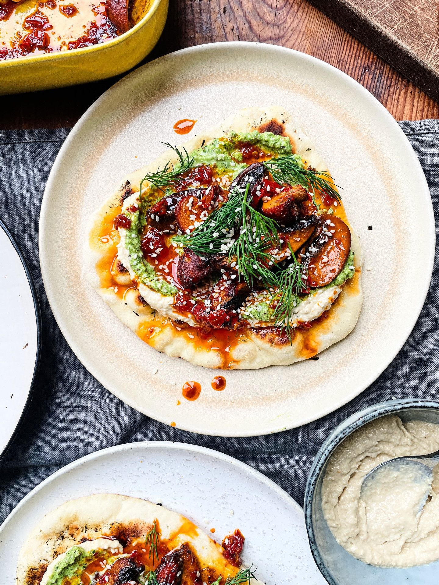 Harissa-Spiced Mushrooms on Za’atar Flatbread with Hummus Delight