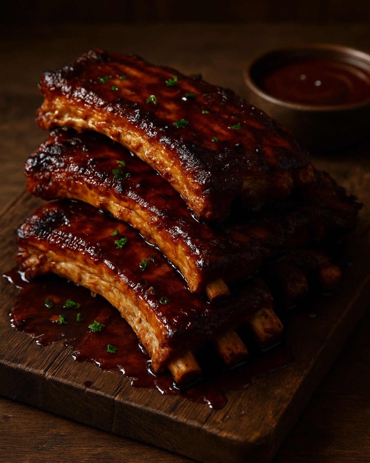 Instructions: 1. Prep the ribs: Remove the silver skin from the back of the ribs. Mix brown sugar, paprika, garlic powder, onion powder, salt, and pepper. Rub all over the ribs. 2. Bake low & slow: Wrap each rack in foil and bake at 300°F (150°C) for 2.5–3 hours until tender. 3. Make the sauce: While ribs bake, simmer BBQ sauce, bourbon, honey, vinegar, mustard, and chili flakes in a saucepan until slightly thickened (10–15 minutes). Set aside. 4. Finish: Remove ribs from foil, brush with sauce. Broil or grill for 5–7 minutes, brushing more sauce until caramelized and glossy. 5. Serve: Slice between the bones, pile onto a platter, and serve with extra sauce.