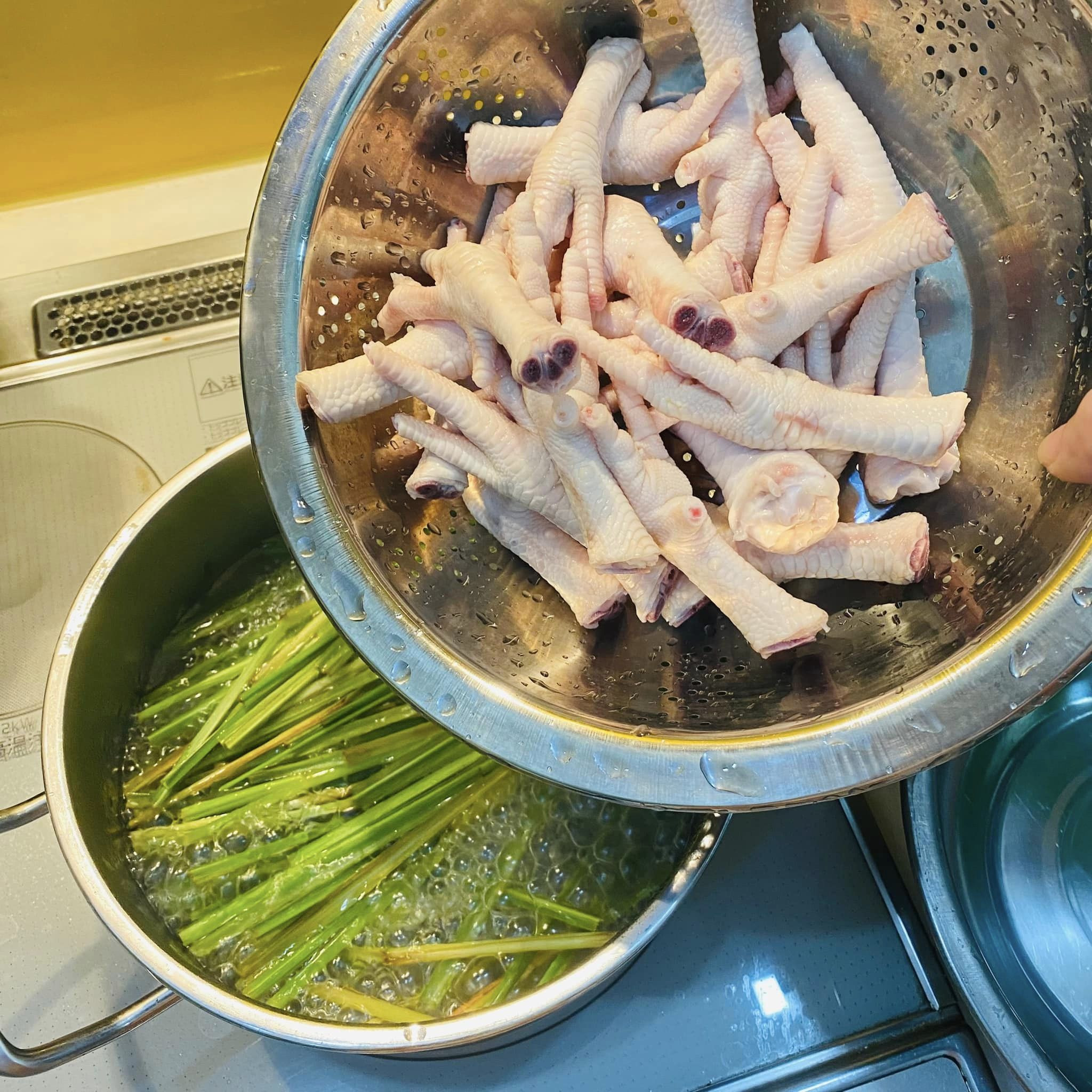 Bắc nồi nước lên bếp, thả lá sả vào. Khi nước sôi, thả chân gà vào chần trong khoảng 2-3 phút. Sau đó, rửa lại chân gà bằng nước sạch vài lần và để ráo nước.