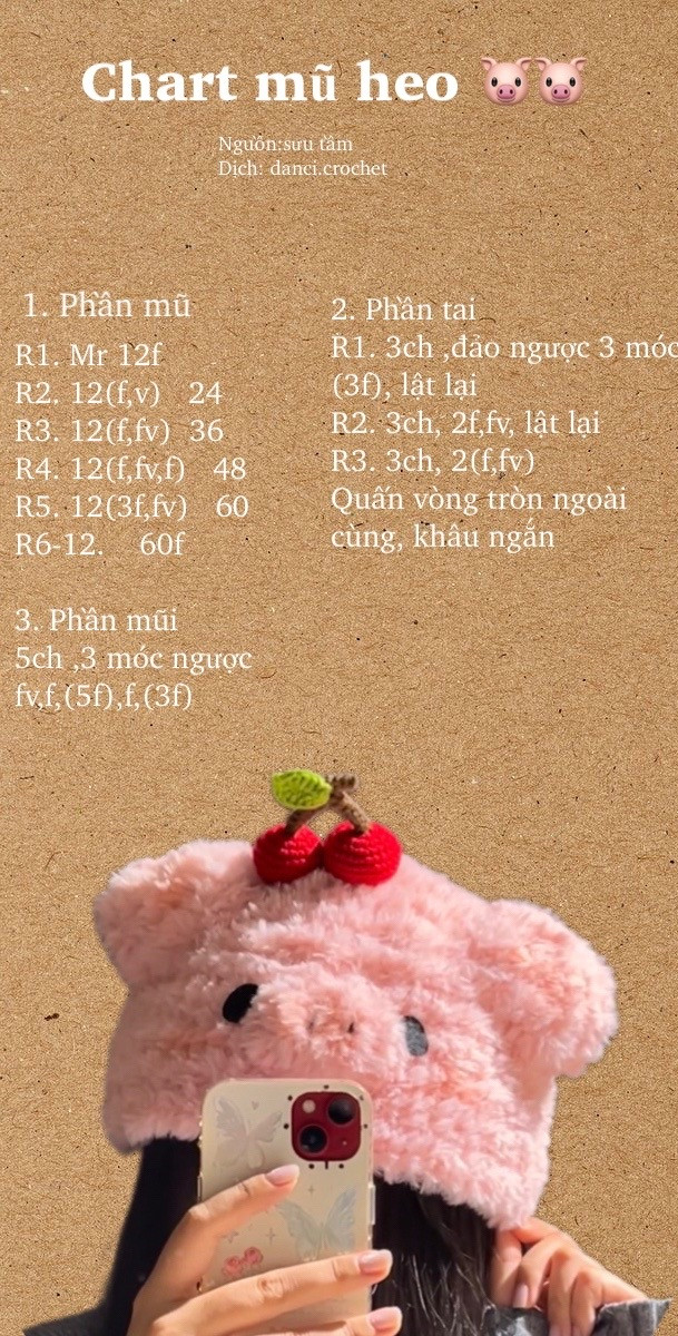Hướng dẫn móc mũ heo dễ thương với họa tiết quả anh đào