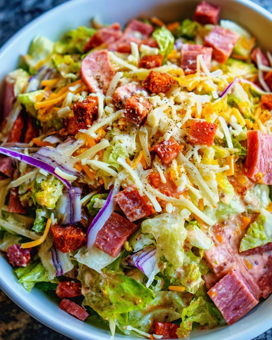 2. In a large mixing bowl, combine lettuce, salami, pepperoni, provolone, onion, tomatoes, pepperoncini, and olives.