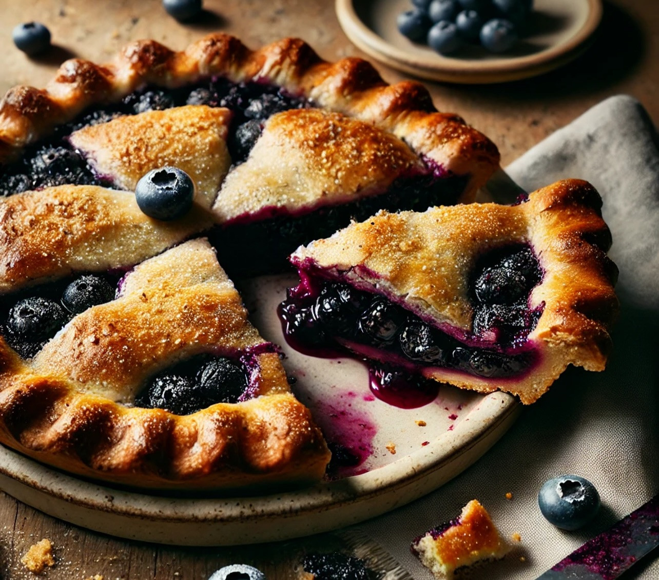 This is the kind of pie that stains your plate and your fingers. Fresh blueberries baked in a flaky crust, bubbling over at the edges, with one imperfect slice that proves it was made at home — not in a factory. Sweet, slightly tart, and unapologetically messy.