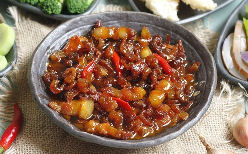 Nguyên liệu: - 200g thịt ba rọi (ba chỉ) cắt sợi - 100g tôm khô loại nhỏ, ngon: rửa sạch, ngâm nước ấm cho mềm, để ráo (để nguyên con hoặc giã sơ) - 240 ml nước mắm ngon (loại đừng mặn gắt quá) - 180g đường cát - 150g nước - Tỏi, hành tím bằm - Hành là cắt khúc - Ít bột ngọt - Tiêu hột, tiêu xay - Ớt quả tươi