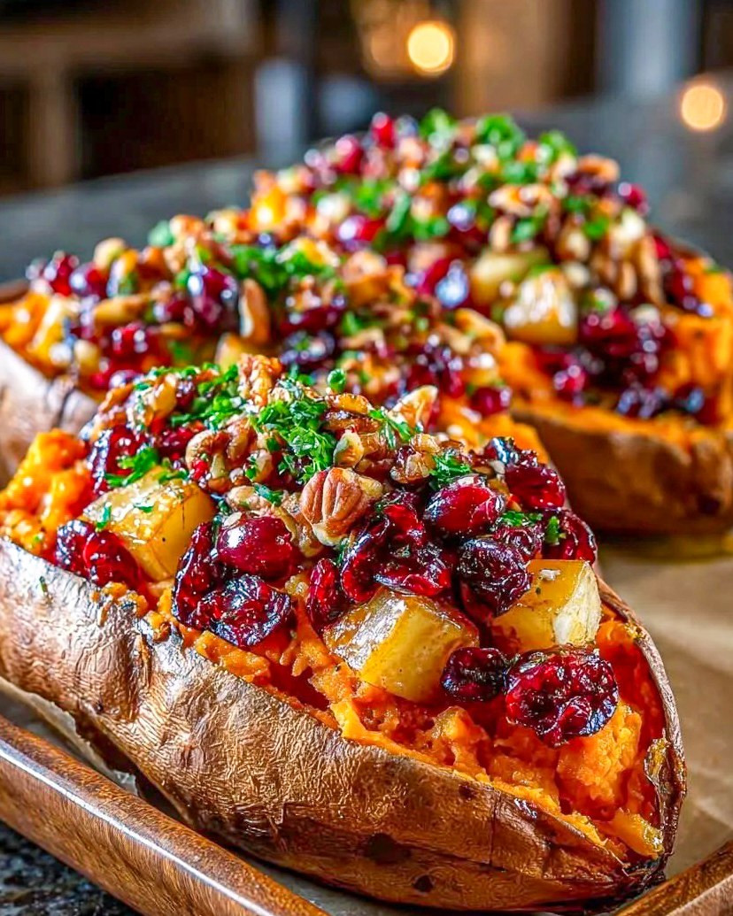 Thành phẩm là những củ khoai lang nướng vàng óng, nhân táo nam việt quất ngọt chua, thơm béo, thêm hạt giòn bùi. Ăn nóng, cảm nhận vị ngọt tự nhiên của khoai hòa cùng trái cây caramel, đúng chuẩn món tráng miệng mùa đông.