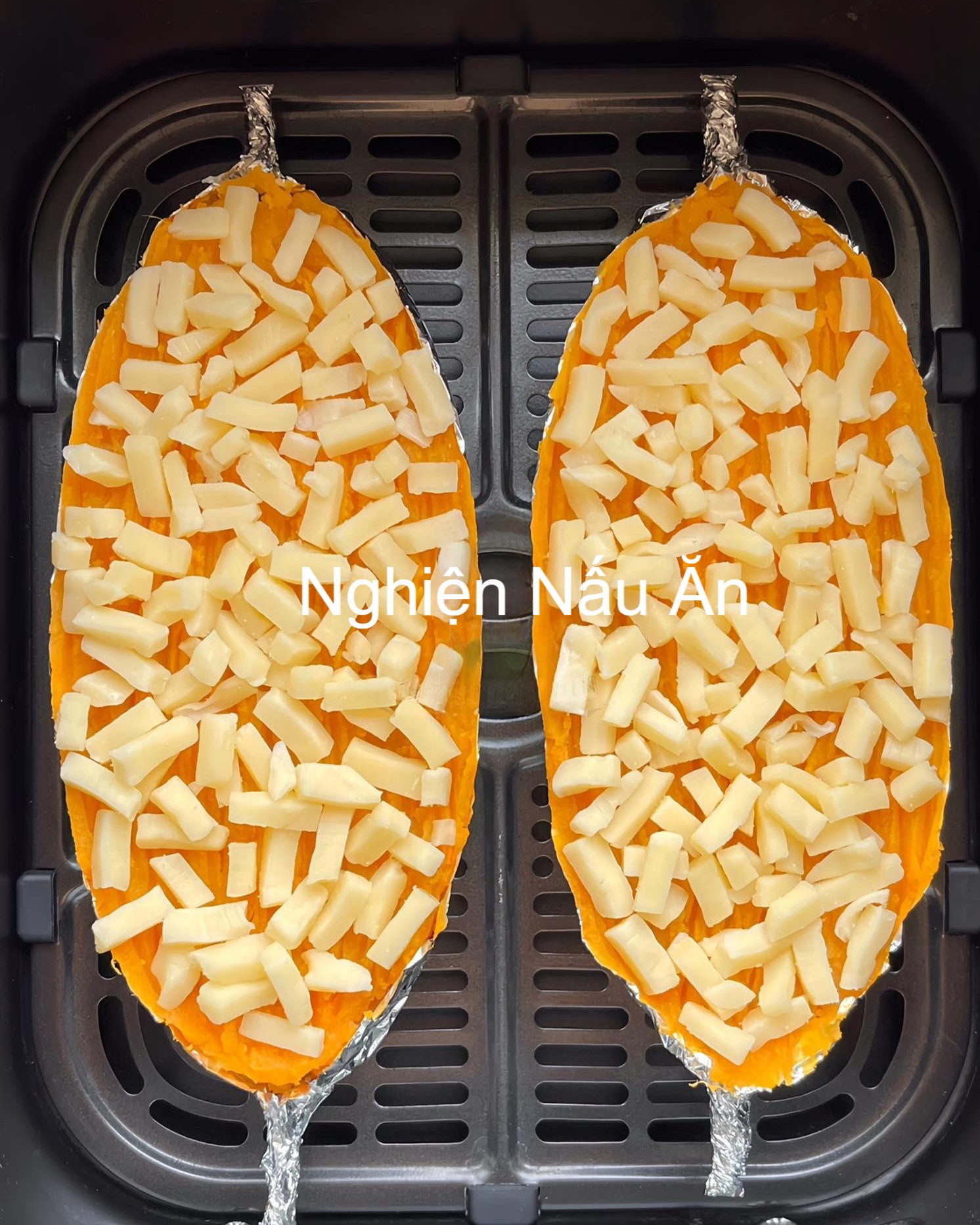 LƯU NGAY CÁCH LÀM KHOAI LANG NƯỚNG PHÔ MAI NGỌT THƠM HẤP DẪN. Chuẩn bị nguyên liệu : - 4 củ khoai lang - 2 thìa sữa đặc - Sữa tươi - Phô mai bào Cách Làm : 1 . Khoai lang gọt vỏ , cắt khúc . Cho vào nồi hấp chín . 2 . Thêm sữa đặc và lượng sữa tươi vừa đủ rồi nghiền thật nhuyễn . 3 . Quấn 2 đầu miếng giấy bạc , tạo hình giống chiếc thuyền rồi cho hỗn hợp khoai lang vào . Dàn đều , rải phô mai bào lên . 4 . Cho vào nồi chiên không dầu ở 170° trong 8 phút rồi lấy ra thưởng thức . Chúc cả nhà thành công với công thức này nhé.