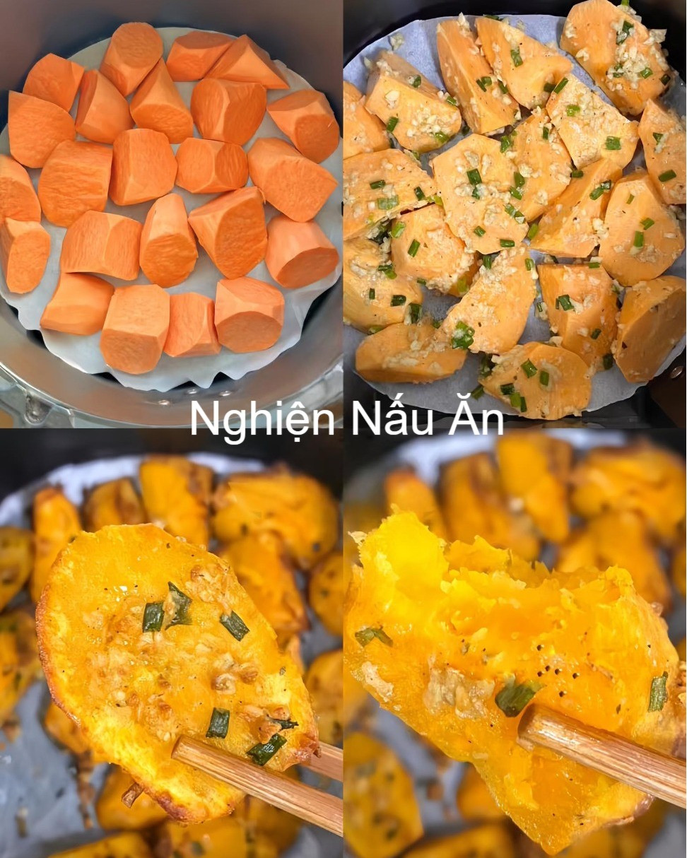 LƯU NGAY CÁCH LÀM KHOAI LANG NƯỚNG TỎI MỀM NGON THƠM NỨC . Chuẩn bị nguyên liệu : - 2 củ khoai lang - Bột mì - Hành lá , tỏi băm - Gia vị : muối , tiêu , dầu ăn Cách Làm : 1 . Khoai lang gọt vỏ , cắt khúc . 2 . Thêm tỏi băm - hành lá - 1 thìa bột mì ( thìa canh ) 1 thìa dầu ăn ( thìa ăn cơm ) cùng 1 ít muối và tiêu rồi trộn đều . 3 . Xếp vào nồi chiên không dầu nướng ở 180° trong 15 phút rồi lật lại nướng thêm 12 phút nữa là xong . Chúc cả nhà thành công với công thức này nhé.