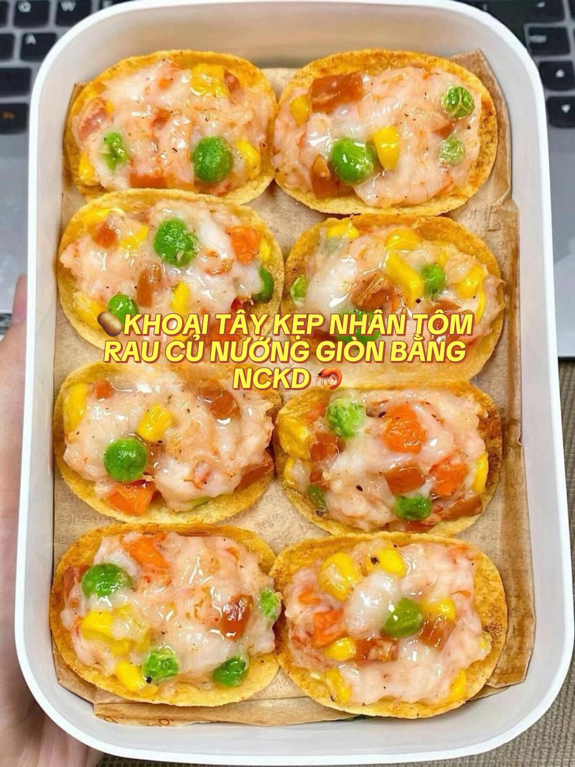 - Lấy 1 lát khoai tây chiên (bim bim), phết 1 lớp nhân tôm rau củ lên mặt (có thể đặt thêm lát khoai khác lên trên để thành sandwich nhỏ).