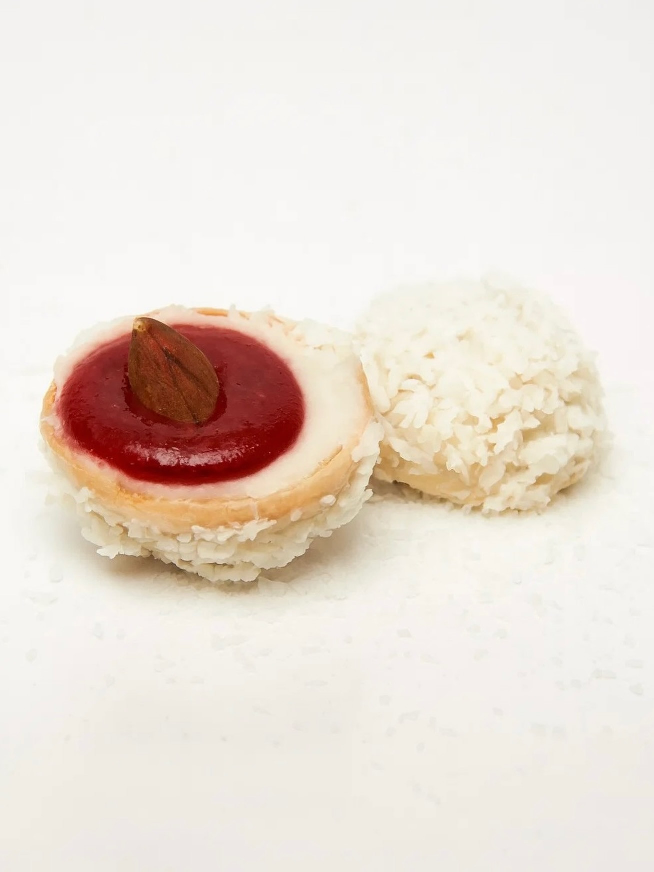 Как собрать: В полусферу выложить немного крема, добавить ½ ч. л. варенья и орешек. Закрыть второй половинкой и слегка прижать. При желании запечатать шов белым шоколадом. Обвалять в кокосовой стружке. Охладить 15–20 минут ✨
