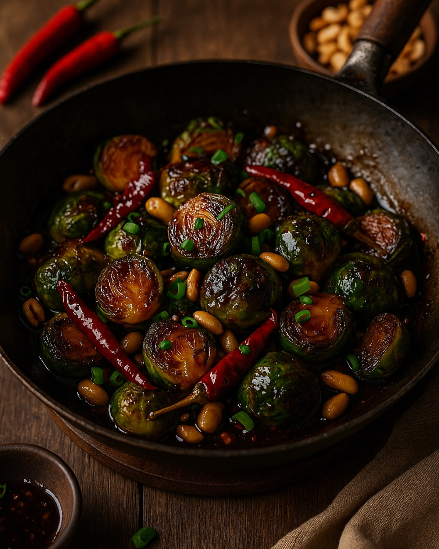 Instructions 1. Mix the sauce – Whisk all sauce ingredients; stir in cornstarch slurry and set aside. 2. Char sprouts – Heat 1 Tbsp oil in a wok on high. Add Brussels sprouts cut-side down; sear 3 min until deep brown. Toss and cook 2 min more. Transfer to a plate. 3. Aromatics & chiles – Add remaining oil, dried chiles, garlic, and ginger; stir-fry 30 sec until fragrant. 4. Combine – Return sprouts; pour in sauce, stirring until it thickens and glazes (1 min). Toss in peanuts and scallions. 5. Serve hot – Plate immediately for maximum crisp edges and saucy shine.
