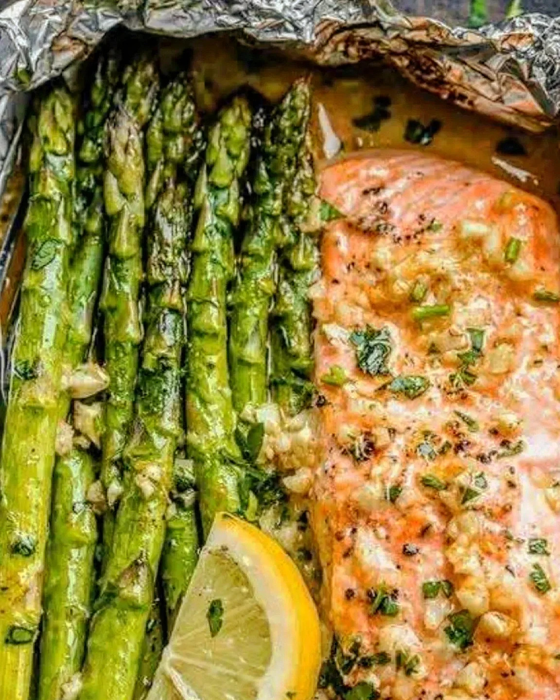 Lemon Garlic Butter Baked Salmon with Asparagus Delight