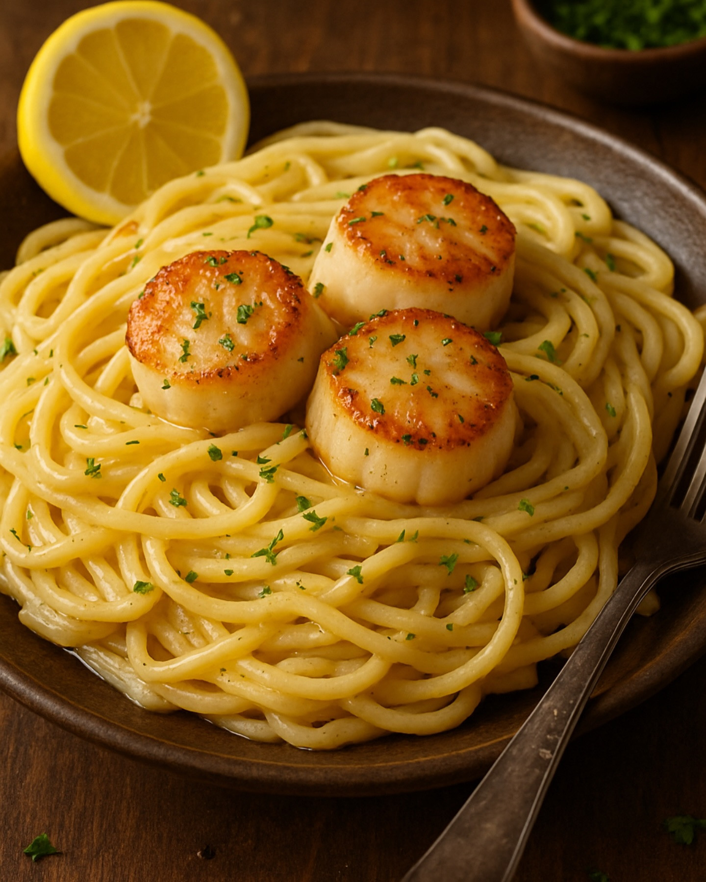 🍝 Creamy Lemon Garlic Linguine with Seared Scallops