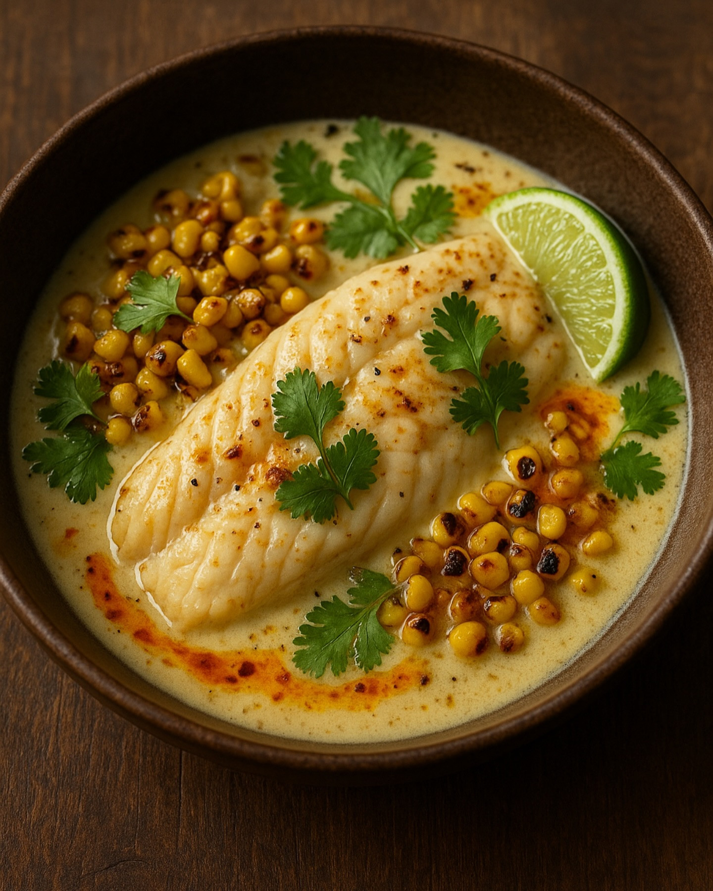 Step-by-Step 1. Infuse & Poach (12 min) In a wide saucepan, combine coconut milk, stock, lemongrass, lime leaves, ginger, shallot & salt. Bring to a gentle simmer. Slide in the corvina; poach 6-8 min, turning once, until opaque and flaky. 2. Char the Corn (4 min) While fish cooks, heat a dry skillet over high. Add butter, then corn; sear until lightly charred. Set aside. 3. Make Chili-Lime Oil (2 min) Warm olive oil over low heat; add chili & lime zest, simmer 1 min. Remove from heat; stir in lime juice & pinch salt. 4. Plate & Finish Spoon coconut broth into shallow bowls. Nestle fish, scatter charred corn, drizzle chili-lime oil. Top with cilantro, serve with rice & extra lime.