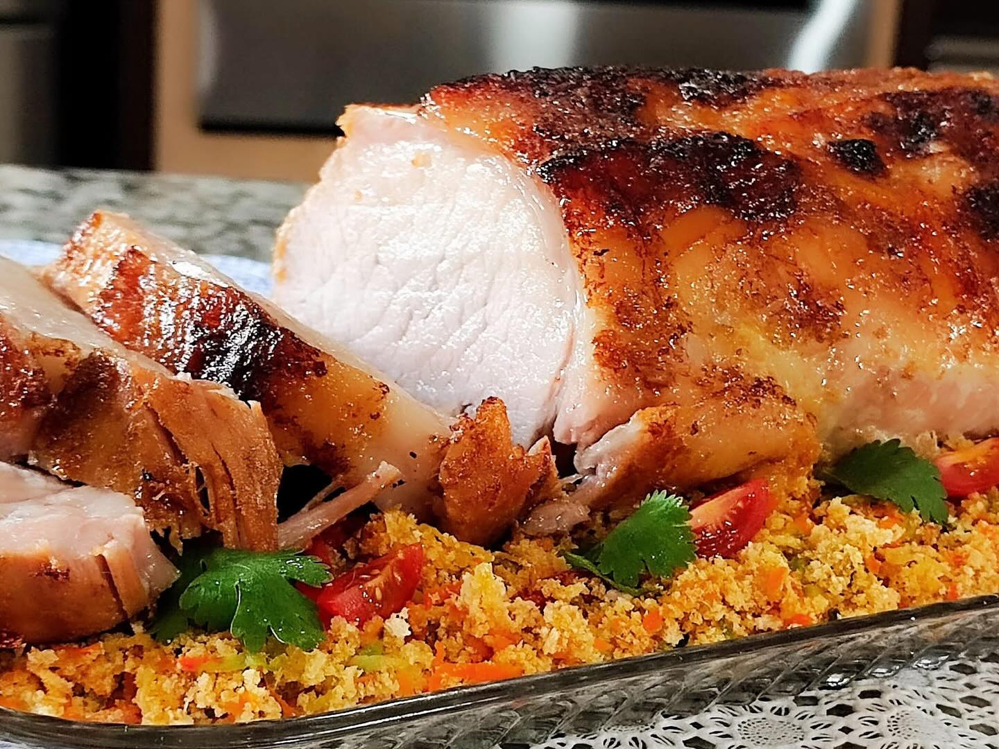 LOMBO DE PORCO ASSADO Ingredientes • 1,5 kg de lombo de porco • 5 dentes de alho picados • 3 colheres (sopa)de mostarda • 3 colheres de sopa de mel • Suco de 2 limões espremidos (60ml) •1 ramo de alecrim fresco • 1 colher de chá de gengibre ralado • 1 colher de chá de páprica defumada • 1 colher(sopa)cheia de Sal e pimenta-do-reino a gosto • Meia xícara de água