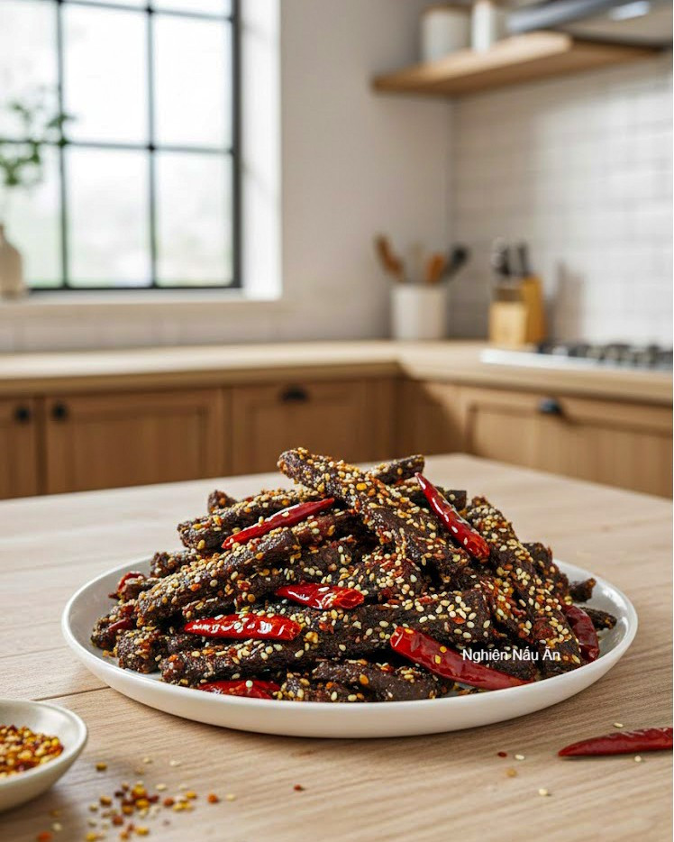 LƯU NGAY CÁCH LÀM BÒ KHÔ CAY TỰ LÀM TẠI NHÀ, NGON KHÔNG KÉM HÀNG TIỆM. Nguyên liệu - Thịt bò (cắt dải dài) - Ớt khô, lá thơm, hoa hồi, quế, gừng thái lát - 6 thìa xì dầu, 2 thìa hắc xì dầu - 1 chút muối, rượu nấu ăn - 20g mè rang chín - 30g ớt bột - 15g bột thì là - 5g bột tiêu Cách làm chi tiết Luộc thịt bò với gia vị - Rửa sạch thịt bò, cắt dải dài. - Cho vào nồi cùng lá thơm, hoa hồi, quế, gừng, xì dầu, hắc xì dầu, muối, rượu nấu ăn. - Đun sôi lửa lớn, sau đó hạ nhỏ lửa nấu 50 phút. - Tắt bếp, ngâm trong nước luộc 3 giờ cho thấm vị. Chiên thịt bò - Vớt thịt bò ra, để ráo. - Chiên ở nhiệt độ khoảng 70°C đến khi miếng thịt sẫm màu. Làm sốt cay dầu đỏ - Phi thơm ớt khô trong dầu nóng. - Cho mè rang, ớt bột, bột thì là, bột tiêu vào, đảo đều tạo màu đỏ đẹp mắt. - Hòa 1 thìa muối vào nước luộc thịt bò, đổ vào chảo dầu đỏ. Xào thịt bò - Cho thịt bò vào chảo, xào lửa lớn cho thấm đều gia vị. - Đảo đến khi ráo nước, thịt khô vừa ăn. Thành phẩm - Thịt bò khô cay, dai ngọt, thơm mùi quế hồi và mè rang. - Màu đỏ nâu đẹp mắt, vị cay nồng hấp dẫn. - Ăn chơi, nhâm nhi hoặc làm quà biếu Tết đều “chuẩn bài”. Chúc cả nhà thành công với món thịt bò khô cay này tự làm sạch sẽ, ngon không kém ngoài hàng!