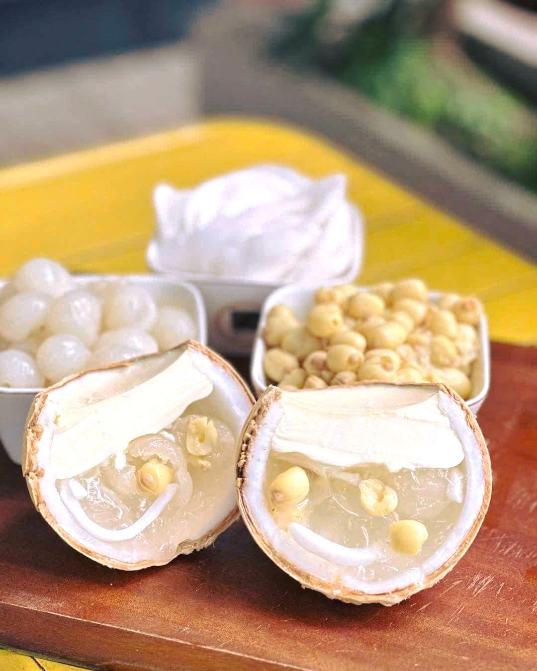 Sơ chế dừa non và nhãn: Bóc vỏ và bỏ hạt nhãn, trần qua nước sôi sau đó ngâm vào chậu nước đá, để ráo.