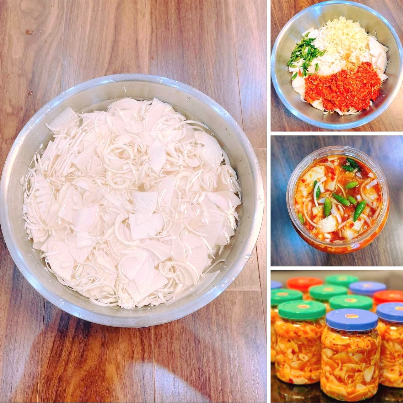 CÔNG THỨC LÀM MĂNG ỚT CAY THƠM NGON - MỌI NGƯỜI ĐIỀU CHỈNH ỚT NHA Nguyên Liệu Măng củ tươi: 2kg Ớt đỏ: 200gr Ớt thóc: 100gr Quả móc mật tươi: 100gr (hôm nay em làm không có vì không mua được) Tỏi: 400gr Muối hạt: 2 thìa ăn cơm Đường: 2 thìa ăn cơm Nước đun sôi để nguội 2500ml Tiến Hành -Măng nhờ người bán bóc vỏ luôn cho ạ. Về rửa sạch gọt bỏ phần già rồi thái mỏng thái theo chiều ngang. Ngâm vào nước muối loãng 30 phút. Thay nước ngâm tiếp qua đêm bằng nước gạo để cho ra bớt độc tố. Vớt ra rổ dội lại một lần bằng nước đun sôi để nguội rồi để ráo nước - Ớt đỏ xay nhuyễn với một chút nước - Tỏi xay nhuyễn - Móc mật rửa sạch để ráo nước - Ớt thóc rửa sạch bỏ cuống để ráo nước - Hoà một bát nước đun sôi để nguội với 1 thìa muối hạt và một thìa đường - Trộn măng - ớt xay - tỏi - 2 thìa muối - 1 thìa đường vào nhau, cho hỗn hợp đã trộn vào lọ thuỷ tinh xếp lần lượt măng - ớt thóc - móc mật xen kẽ cho đẹp mắt sau đó đổ nước muối đã pha ngập măng. Thêm một chút nước mắm cho thơm nữa nhé Đậy kín nắp để nơi thoáng mát 3 ngày. Măng ớt ăn bún, miến, mì tôm, chấm mắm thịt luộc thì lu mờ hết các món khác. Tuy nhiên ăn măng rất hại dạ dày chúng ta nên kiềm chế để không phải trả giá nhé. Chúc cả nhà thành công với cách làm trên.