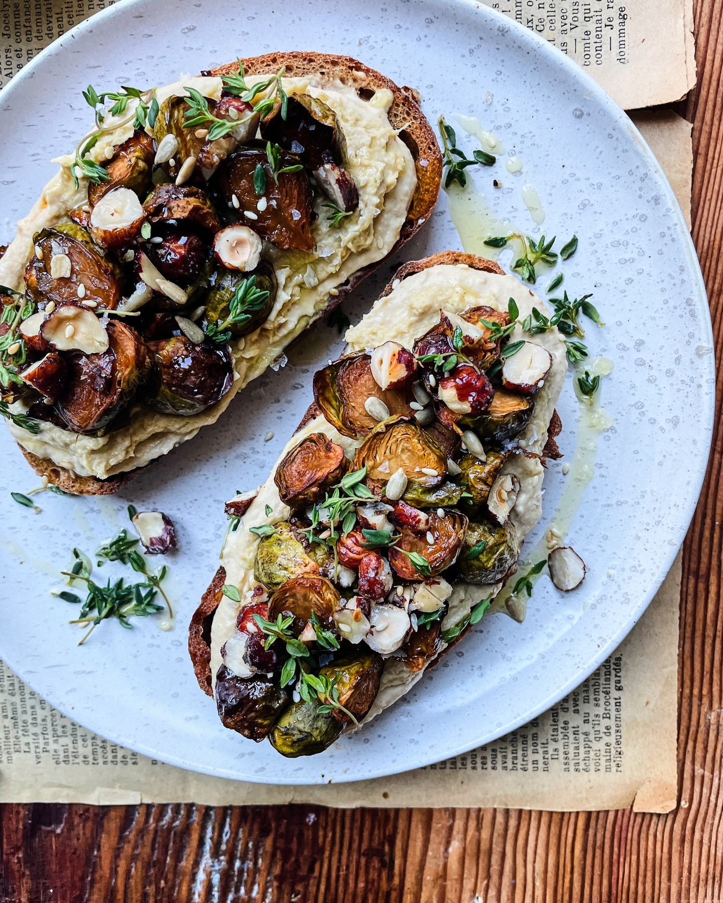 Maple-Glazed Sprout Toast with Caramelised Leek Hummus