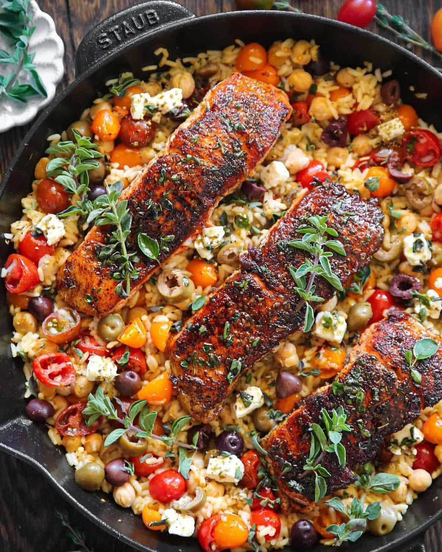 Mediterranean Herbed Salmon with Lemon Rice and Feta