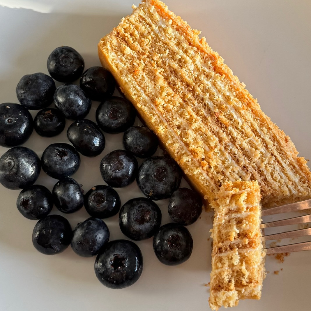 medovik cake 🤍 ⠀ cake layers: ⠀ • 4 eggs • 200 g sugar • 4 tbsp honey • 250 g butter • 1 tsp baking soda • 600 g flour ⠀ combine eggs, sugar, honey and butter and place over a water bath (about 8 minutes), stirring constantly. add baking soda and keep on the water bath for another 5 minutes. remove from heat and gradually add flour in small portions. mix well and let the dough cool completely. ⠀ divide the dough into 8–9 parts and roll out the cake layers. don’t add extra flour while rolling, so the dough stays soft. ⠀ this is how i did it: ⠀ place a portion of dough on parchment paper, cover with another sheet of parchment on top and roll out each layer this way. ⠀ bake each layer at 180°c for about 5 minutes. ⠀ cream: ⠀ 700 g sour cream (at least 20% fat) (this time i used 10% greek yogurt + mascarpone) 200 g sugar juice of 1/2 lemon zest of 1/2 lemon ⠀ mix everything together. spread the cream between the layers and leave overnight in a cold place.