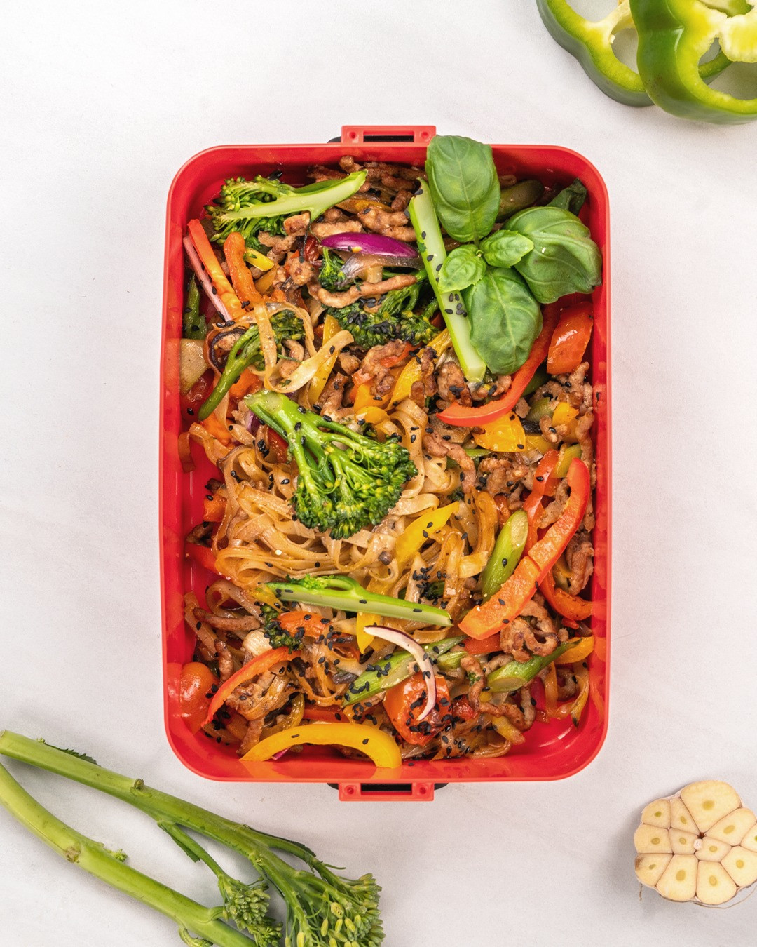 Cách làm: 1️⃣ Đun nóng dầu mè trong chảo. Cho tỏi băm vào phi thơm trong vài giây. 2️⃣ Thêm thịt heo xay vào và nấu cho đến khi thịt săn vàng. Nêm xì dầu và dầu hào, sau đó trộn đều. 3️⃣ Cho ớt chuông và bông cải xanh vào. Nấu thêm 2-3 phút cho đến khi rau củ hơi mềm nhưng vẫn giữ được độ giòn. 4️⃣ Thêm mì gạo (đã luộc theo hướng dẫn trên bao bì) vào và trộn thật đều tất cả các nguyên liệu. 5️⃣ Chuyển món mì xào ra hộp cơm và rắc tỏi tây băm nhỏ cùng hạt vừng lên trên.
