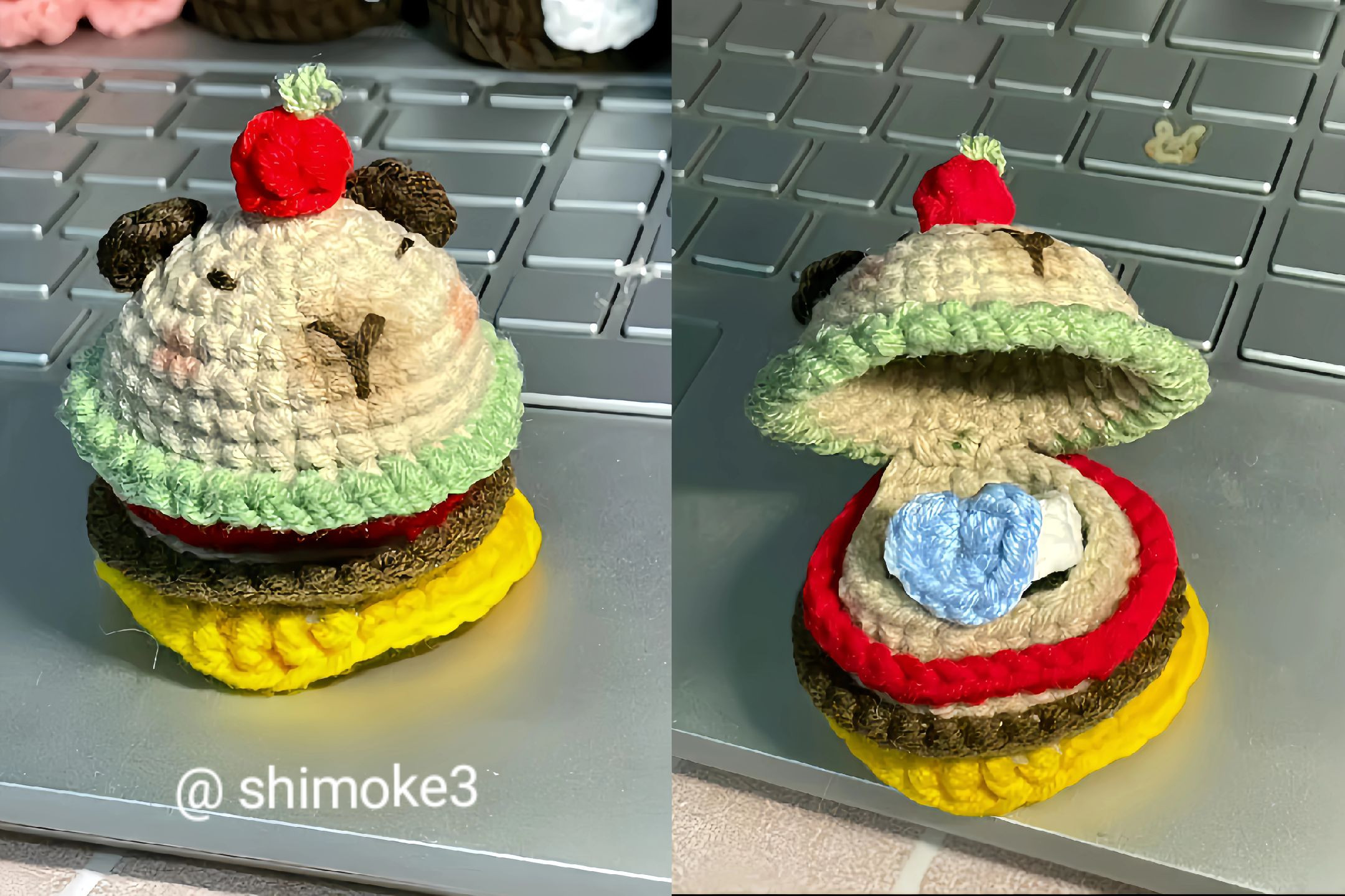 Móc len bánh hamburger thú vị với trái tim ẩn giấu bên trong