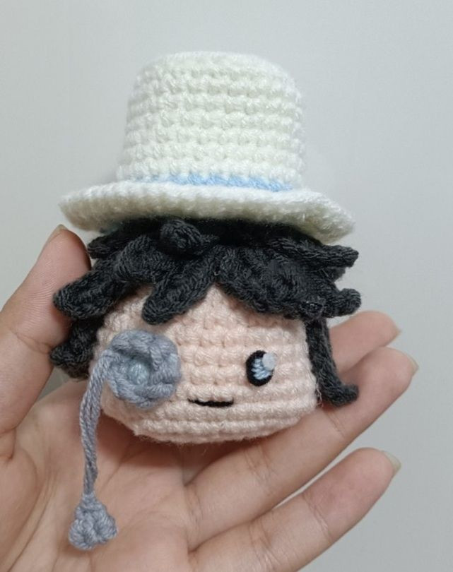 Móc len búp bê nhỏ đội mũ trắng và kính một tròng
