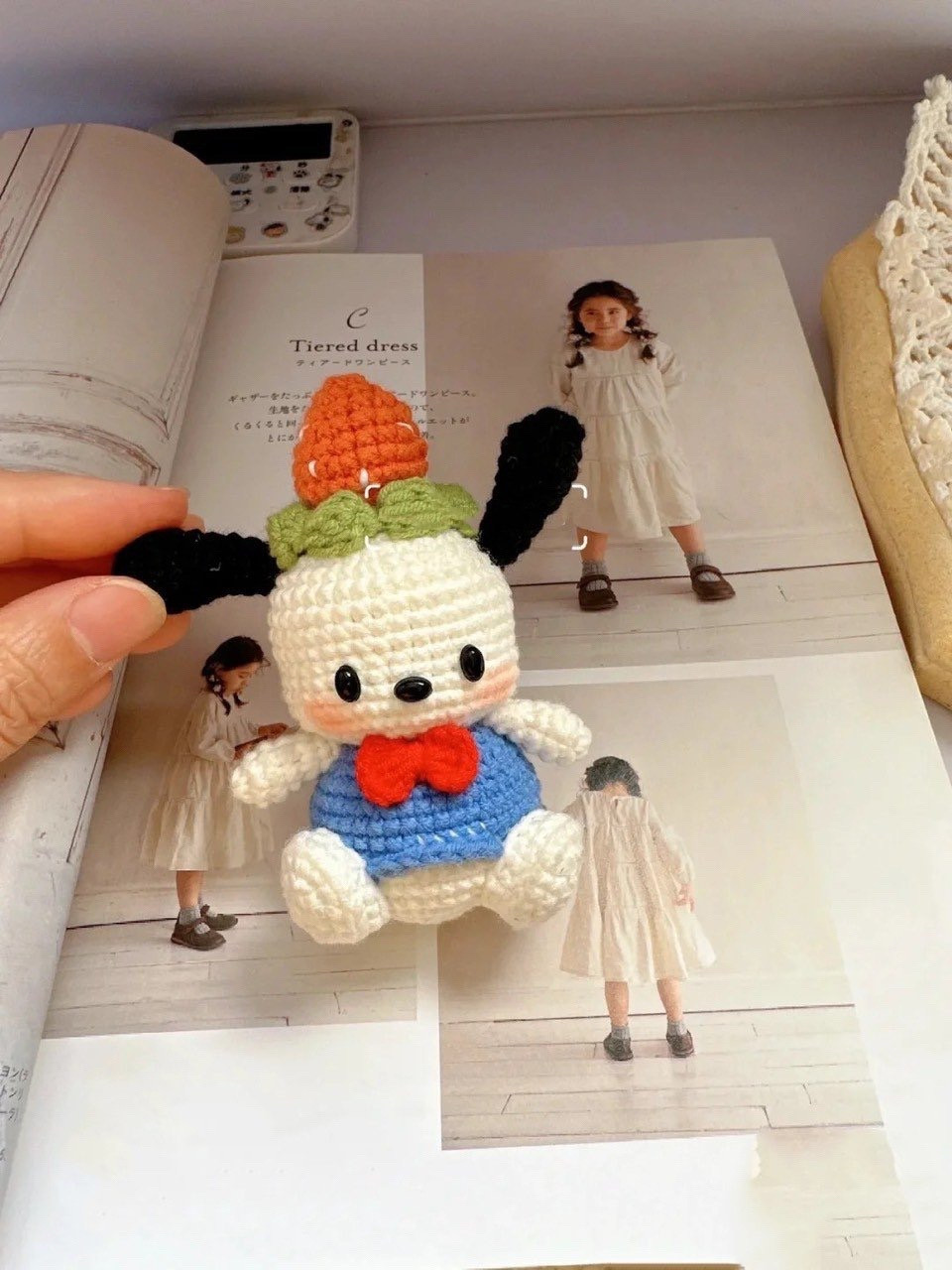 Móc len hình chú chó dễ thương với nơ đỏ và áo xanh.
