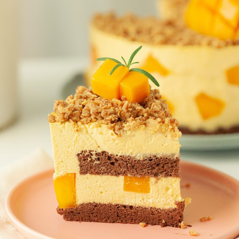 Mousse Xoài – Dừa – Sữa Chua Món Tráng Miệng Mát Lạnh Cho Ngày Hè Nguyên liệu (cho bánh tròn đường kính 16cm): A. Mousse xoài dừa: 13 gram gelatin dạng lá 280 gram thịt xoài chín 80 gram nước cốt dừa 40 gram sữa đặc 50 gram sữa chua không đường 250 gram kem tươi 25 gram đường xay Xoài tươi cắt miếng và dừa non để cho vào giữa bánh (không bắt buộc) B. Bạt bánh socola: Bạn có thể chọn bất kì công thức bạt bánh socola nào tùy thích. Mình dùng công thức bạt gato cơ bản bất bại 4 trứng nướng trong khay 22x30cm. Công thức kèm các lưu ý quan trọng mình đã ghi rất cụ thể tại đây, chỉ thay 10 gram bột mì bằng 10 gram bột cacao nguyên chất. C. Topping yến mạch giòn (không bắt buộc): 70 gram bột mì 30 gram yến mạch cán dẹt 25 gram đường vàng ¼ thìa cafe muối tinh 50 gram bơ nhạt đun chảy ½ thìa cafe nước cốt chanh Cách làm: A. Mousse xoài dừa: Xay nhuyễn thịt xoài với nước cốt dừa và sữa đặc. Ngâm gelatin trong nước lạnh tới khi gelatin nở mềm. Đun hỗn hợp xoài trên lửa nhỏ nhất tới khi ấm nóng thì cho gelatin (đã ngâm mềm và vắt kiệt nước) vào, khuấy nhanh tay cho gelatin tan hoàn toàn. Bắc nồi khỏi bếp, cho sữa chua vào khuấy đều, để hỗn hợp này nguội hoàn toàn. Đánh kem tươi với đường tới khi kem bông mềm, gần cứng. Chia hỗn hợp xoài thành 3 phần, trộn với kem tươi theo kĩ thuật fold. B. Hoàn thiện bánh: Chuẩn bị khuôn đế rời, lót giấy nến vào đáy khuôn và mica quay thành khuôn. Cắt 2 lớp bạt bánh, 1 lớp vừa với khuôn để làm đế, 1 lớp nhỏ hơn để xếp vào giữa bánh (không bị lộ lớp bạt bánh thứ 2 này ra ngoài). Xếp bạt bánh vào đáy khuôn, xếp xoài cắt miếng quanh thành khuôn. Cho ½ lượng kem mousse vào, rắc thêm xoài tươi, dừa non tùy sở thích. Xếp lớp bạt bánh thứ 2 và đổ nốt phần kem còn lại, dàn phẳng mặt kem. Để bánh vào tủ lạnh tối thiểu 4 giờ trước khi thưởng thức. Chúc bạn thành công và ngon miệng!