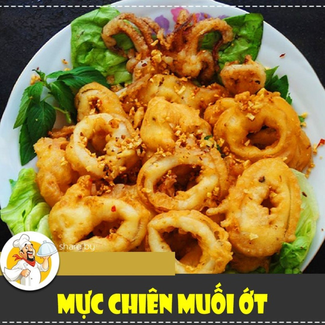 Nguyên liệu: – 500g mực ống – thìa cà phê muối tinh – 1 thìa canh hạt tiêu, rang thơm – 50g bột mỳ – 80g bột ngô – 3-4 quả ớt – 2 nhánh hành lá – Dầu ăn Cách làm: -Mực làm sạch, phần râu và thân để riêng. Xắt khúc phần thân mực thành các đoạn dài khoảng 2cm, để ráo nước -Muối rang khô, cho vào cối giã cùng hạt tiêu -Cho 2/3 hỗn hợp muối – tiêu vào trộn đều cùng bột mỳ và bột ngô trong một tô lớn (hỗn hợp A) -Ớt và hành lá xắt khúc, để riêng -Mực thấm cho khô, đổ vào hỗn hợp (A), trộn đều cho mực được bao đều bởi bột – muối. -Cho dầu vào chảo sâu lòng, làm nóng với lửa vừa – to và cho mực vào chiên (bạn nhớ rũ hết bột thừa bám vào mực trước khi thả vào chảo nhé) tới khi mực có màu vàng nhẹ thì vớt mực ra, để lên giá cho ráo dầu. Mực chiên không lâu, chỉ khoảng 1-1,5 phút là chín; nếu bạn chiên quá lâu mực sẽ bị teo lại và dai, mất vị ngọt. -Cuối cùng cho mực đã chiên vào một tô trộn lớn, rắc hành, ớt và chỗ muối – tiêu còn lại lên trên, xóc hoặc trộn đều rồi bày lên đĩa. -Bạn nên dùng ngay khi còn nóng sẽ giữ được vị ngọt của mực. Nếu thích bạn cũng có thể chiên thêm ít bánh mì ăn kèm.