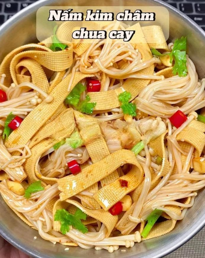 Nấm kim châm chua cay Chuẩn bị nguyên liệu : - Nấm kim châm - Mì váng đậu - Gia vị : Nước tương , đường , giấm , ớt , mè trắng . Cách Chế biến : 1 . Nấm kim châm rửa sạch , cho vào nồi chần nhanh rồi vớt ra . 2 . Mì váng đậu khô ngâm qua nước cho mềm rồi cho vào nồi chần trong khoảng 3-4 phút rồi vớt ra , để ráo . 3 . Pha nước sốt theo tỉ lệ sau : 3 thìa nước tương , 1 thìa đường , 2 thìa giấm ,1 ít ớt xắt và mè rồi khuấy đều hỗn hợp . 4 . Cho nấm kim châm và mì váng đậu vào bát lớn , rưới nước sốt vừa pha lên . Trộn đều & thưởng thức