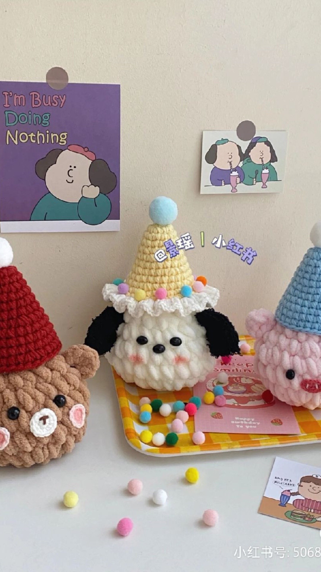 Những chú thú nhồi bông len đội mũ sinh nhật đáng yêu và thú vị