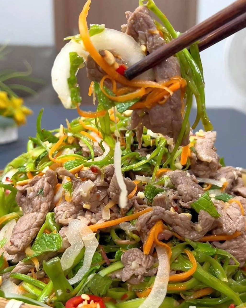 CÔNG THỨC LÀM NỘM BÒ RAU MUỐNG SIÊU NGON TẠI NHÀ CỰC ĐƠN GIẢN Nguyên liệu: 200g thịt bò thăn 1 muỗng cà phê hành tím băm 1 muỗng cà phê hạt nêm rau củ 1 muỗng cà phê tỏi băm 1/2 muỗng cà phê đường 1/2 muỗng cà phê hạt tiêu xay 1 muỗng canh nước tương 300g cọng rau muống Húng quế, thái nhỏ 1 củ hành tây vừa, thái sợi Nửa củ cà rốt 1 quả ớt sừng, bỏ hạt, thái sợi 3 tép tỏi, băm nhỏ Dầu ăn Lạc rang, giã dập vừa Nguyên liệu nước trộn nộm: 2 muỗng canh nước lọc 2 muỗng canh đường 1/2 muỗng cà phê muối 1/2 muỗng cà phê hạt tiêu xay 1 muỗng cà phê hành tím băm 1 ½ muỗng canh giấm gạo 1 muỗng canh dầu ăn Nguyên liệu nước chấm chua ngọt: 1 muỗng canh đường 1 muỗng canh nước mắm 5 muỗng canh nước 1 muỗng cà phê ớt băm 1 muỗng cà phê tỏi băm ½ muỗng canh giấm gạo Cách làm: Bước 1: Thịt bò rửa sạch, thấm ráo nước, thái mỏng ngang thớ để thịt bò được mềm. Bước 2: Ướp thịt bò với hành tím băm, hạt nêm, tỏi băm, đường, hạt tiêu, nước tương và một chút dầu ăn. Để sang một bên trong khoảng 30 phút cho thịt bò ngấm gia vị. Bước 3: Rau muống nhặt hết lá, giữ lại cọng, rửa sạch. Chẻ cọng rau nhỏ ra. Ngâm vào bát nước lạnh có pha một chút nước cốt chanh. Như vậy rau muống sẽ trắng, giòn và tạo độ cong cho cọng rau rất đẹp. Sau khi ngâm khoảng 5 phút, vớt ra, rửa qua nước lạnh. Sau đó xắt khúc khoảng 5 cm để có thể dễ dàng trộn nộm. Cho vào tô và dùng màng bọc thực phẩm bọc kín lạ. Cho vào ngăn mát tủ lạnh. Như vậy giúp rau muống giòn và ngon Bước 4: Đun nóng chảo, cho dầu ăn vào đun ở mức nhiệt vừa. Khi dầu nóng, cho 3 tép tỏi băm vào phi thơm. Khi tỏi vàng, cho thịt bò đã ướp vào đảo đều, nhanh tay. Xào ở mức nhiệt cao để thịt bò chín mềm. Khi thịt bò vừa chín tới thì tắt bếp và cho ngay ra đĩa, để nguội. Bước 5: Pha nước trộn nộm: Trong một bát nhỏ, trộn các nguyên liệu làm nước trộn nộm: nước, đường, muối, hạt tiêu, hành tím. Khuấy đều cho đến khi đường tan hết. Sau đó cho giấm gạo và dầu ăn vào. Bước 6: Trong một bát nhỏ khác, pha các nguyên liệu làm nước chấm chua ngọt. Khuấy đều cho tan hết. Bước 7: Trong một âu lớn, trộn các nguyên liệu: Rau muống chẻ, thịt bò xào, húng quế, cà rốt , hành tây, ớt thái sợi, nước trộn nộm. Trộn đều và để 10-20 phút cho nộm ngấm gia vị.
