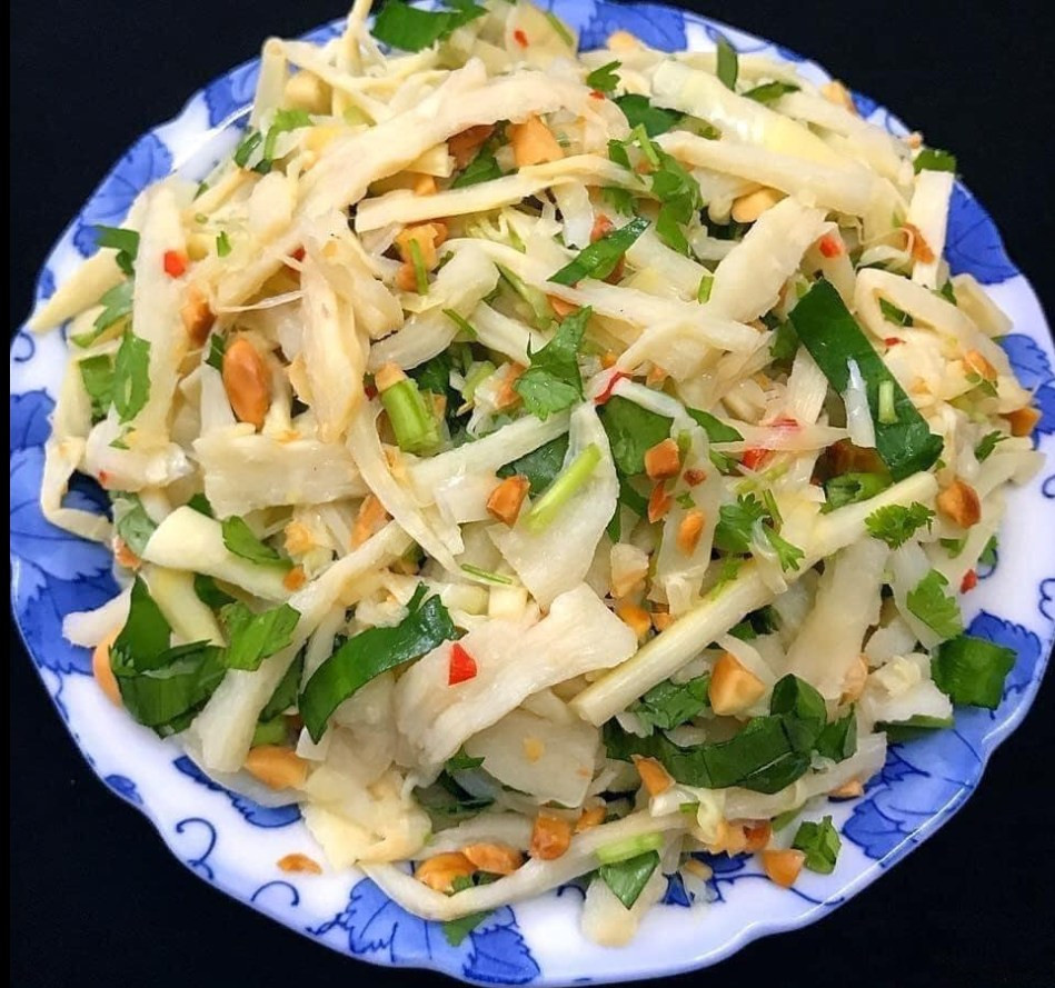 Nộm măng Măng mua về (ngon nhất là măng tươi),luộc cho hết nước vàng,rửa sạch,chẻ nhỏ và mỏng Lạc rang giã nhỏ vừa,rau húng lìu,rau mùi răng cưa,mùi ta thái nhỏ vừa ăn Pha nước trộn: 1 thìa canh chanh+2 thìa nước mắm+2 thìa canh đường+tỏi ớt băm nhuyễn. Cho măng ta bát to,cho từ từ nước trộn vào đến khi vừa miệng dừng lại,trộn đều cho ngấm,sau đó tiếp tục cho rau thơm và lạc là xong (nếu không thích ăn nước mắm thì chỉ cần trộn bột canh,chút đường,chanh,tỏi ớt theo khẩu vị) Ẩn bớt