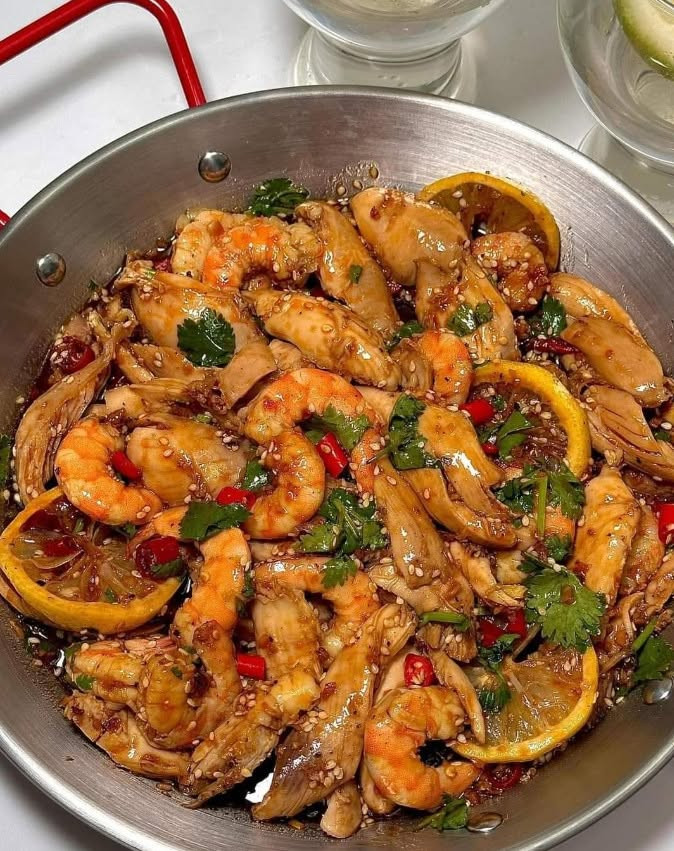 CÁCH LÀM - Pha nước tương: cho tỏi băm, ớt, vừng vào bát rồi rưới dầu nóng lên cho dậy mùi thơm. Sau đó nêm thêm 2 thìa nước mắm, 1 thìa giấm, 1 thìa dầu hào, 1/2 thìa xì dầu, một chút muối và hạt tiêu, 2 thìa đường rồi khuấy đều lên - Đùi gà luộc cùng hàng gừng và một chút rượu nấu ăn. Khi nước sôi thấy có bọt nổi lên thì các bạn hớt hết bọt ra rồi chuyển sang lửa nhỏ luộc khoảng 30 phút - Luộc xong thì vớt đùi gà ra ngâm nước lạnh, lột da rồi xé thành miếng nhỏ - Tôm bỏ đầu, bỏ chỉ lưng rồi luộc khoảng 3 phút. Sau đó vớt ra ngâm nước lạnh rồi bóc vỏ - Cho thịt gà và tôm vào bát, thêm 3-4 lát chanh rồi đổ nước tương vào, thêm chút ra thơm nữa rồi trộn đều lên là xong. Cre : suutam