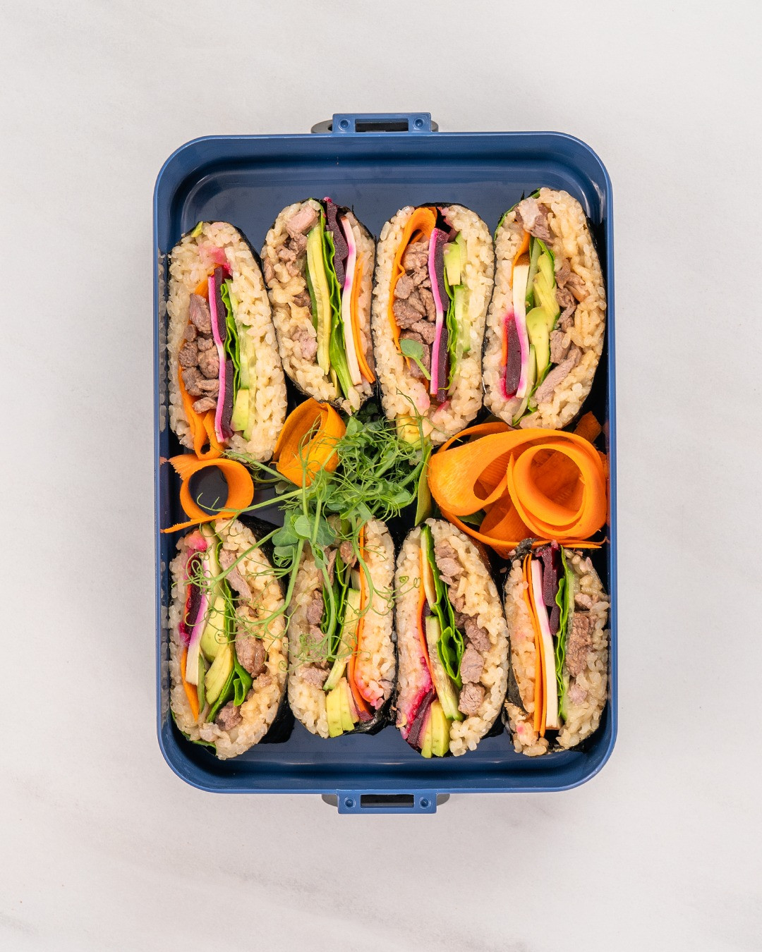 Nguyên liệu: Phần Onigirazu: ✅ 2 lá rong biển nori khô (dùng làm sushi) ✅ ½ quả bơ lớn, thái lát ✅ ½ củ dền, thái sợi ✅ 1 củ cà rốt, thái sợi ✅ Vài lát dưa chuột ✅ Một nắm rau bina tươi (spinach) hoặc xà lách Măng Cừu (lamb's lettuce) ✅ 1-2 củ khoai lang đã thái lát và nướng (tùy chọn) ✅ 75g đậu phụ xông khói hoặc đậu phụ đã ướp gia vị ✅ 250g thịt thăn bò (lõi thăn vai hoặc thăn lưng bò cũng dùng được!), thái hạt lựu ✅ 1 thìa canh xì dầu (nước tương) (để nấu thịt) ✅ Tương ớt Sriracha ✅ Sốt Mayonnaise (có thể trộn thêm chút wasabi nếu muốn) ✅ Hạt vừng đen (để trang trí)