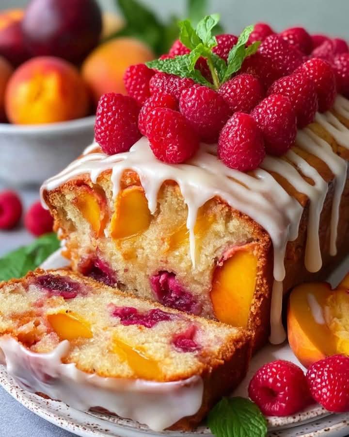 Ingredientes: 190 g de harina todo uso 1 cucharadita de polvo de hornear 1/2 cucharadita de bicarbonato de sodio 1/4 cucharadita de sal 115 g de mantequilla sin sal, suavizada 150 g de azúcar granulada 2 huevos grandes 1 cucharadita de extracto de vainilla 120 g de crema agria 60 ml de leche 150 g de melocotones frescos, pelados y picados 150 g de frambuesas frescas 60 g de azúcar glas 2 cucharadas de jugo de limón Frambuesas y hojas de menta para decorar Preparación Paso a Paso: 1. Precalienta el horno y prepara el molde
