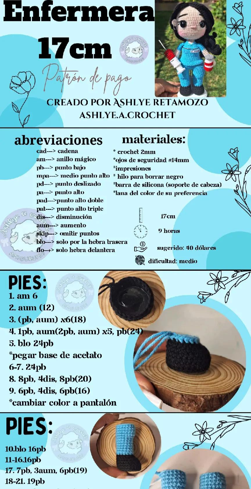 - Patrón de amigurumi de enfermera de 17cm de altura.