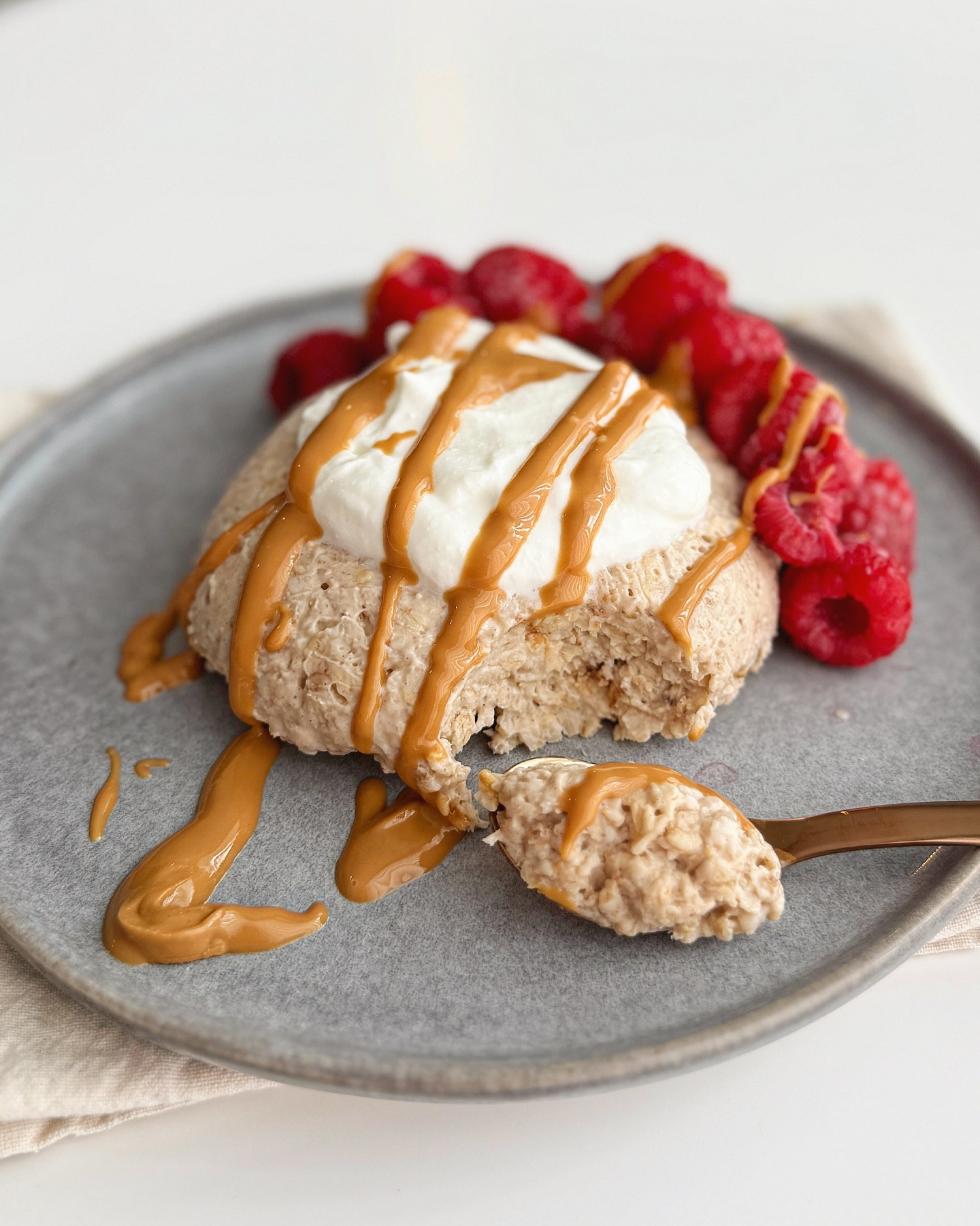 1) In a saucepan, stir everything together and cook on stovetop until thickened 2) Line a bowl with cling film, pour in the oats, cover with a plate and refrigerate (overnight or as long as possible) 3) Flip it onto a plate and top with whatever you’re feeling. I went for skyr (for extra protein) and raspberries (for fruit)