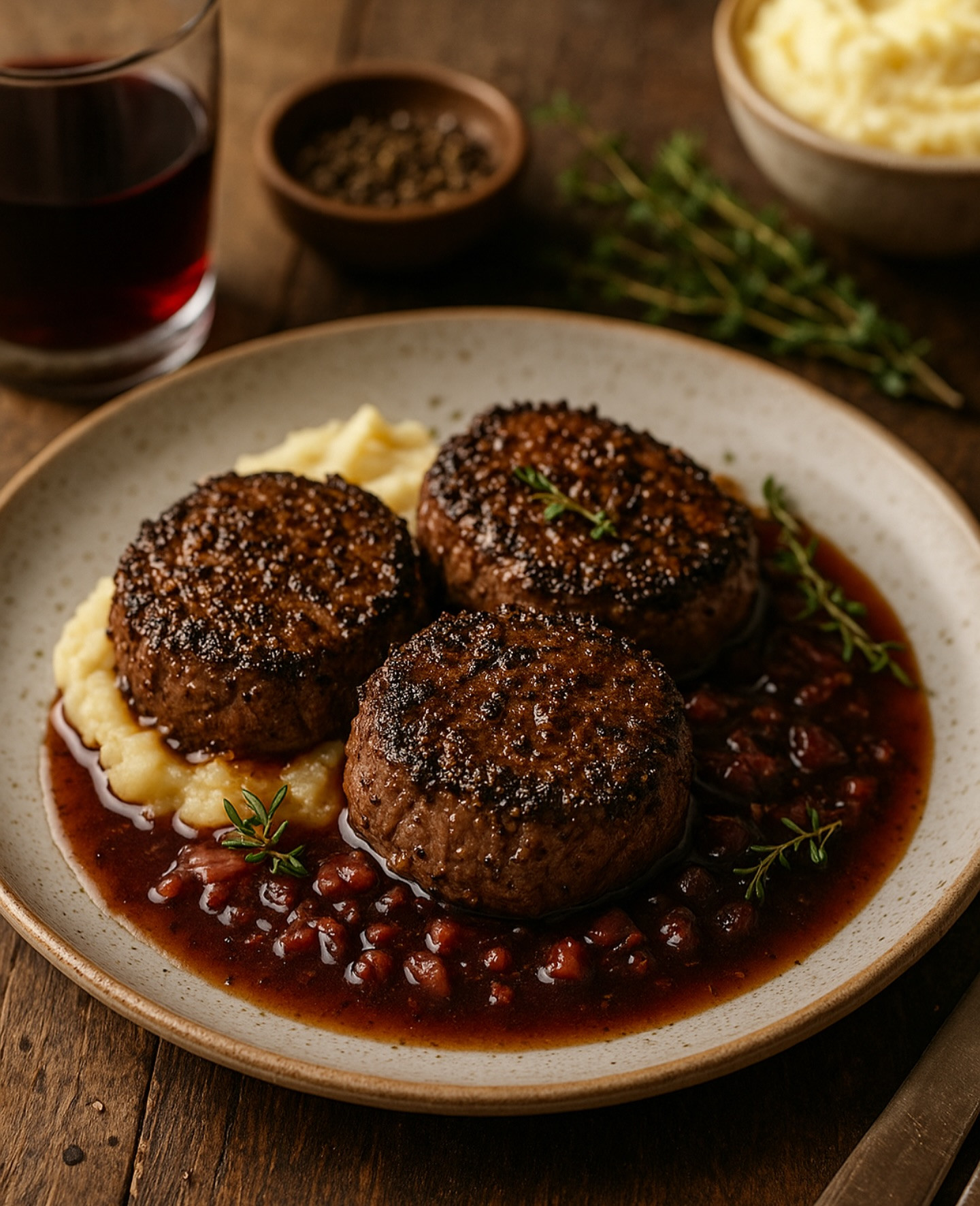 Pepper-Crusted Beef Medallions with Red Wine Sauce Tender beef medallions coated in cracked black pepper, seared to perfection, and served with a bold red wine reduction — a restaurant-worthy dish made at home.